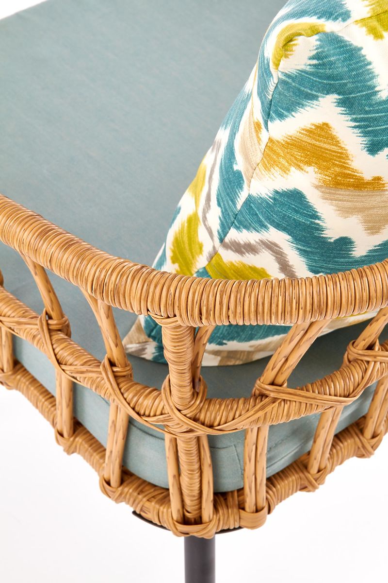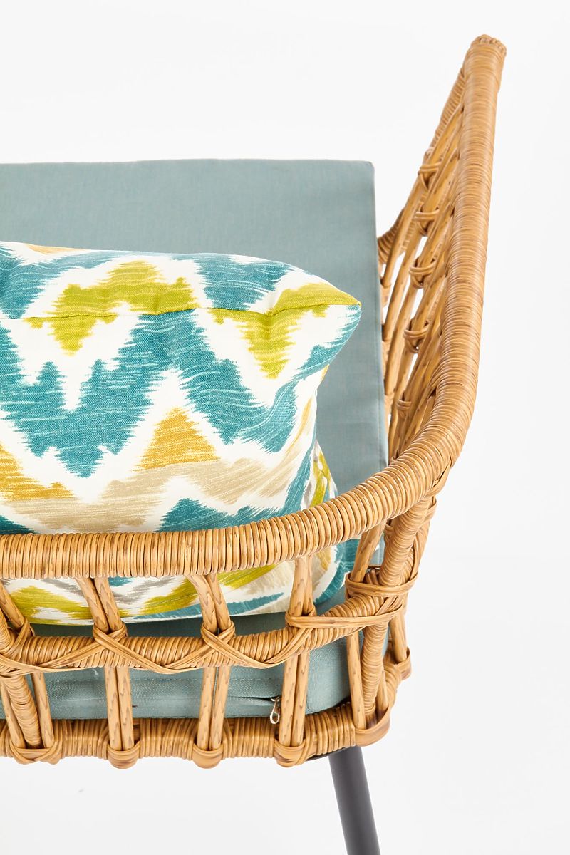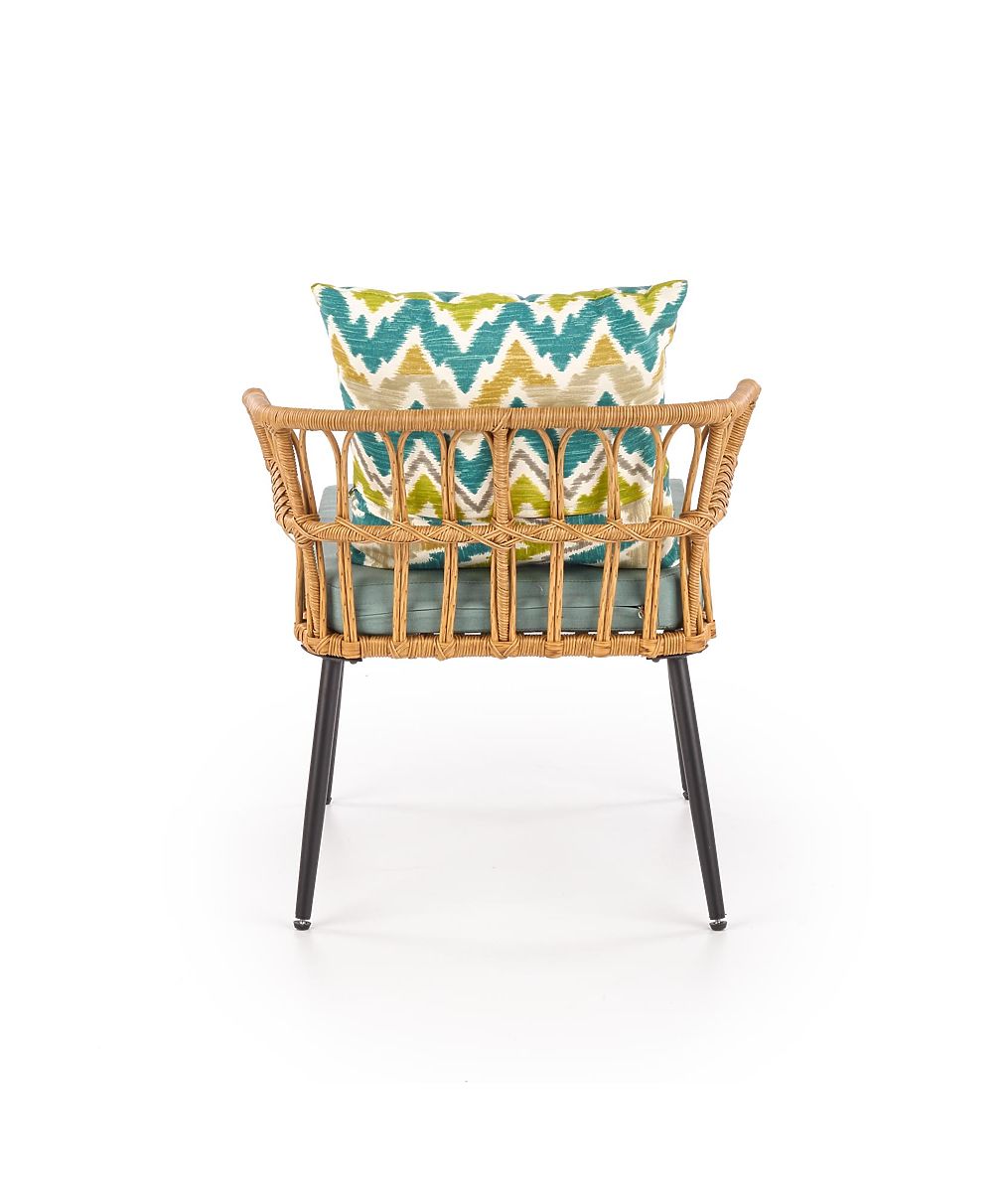 A stabil szerkezetet fekete színű porszórt acél alkotja, amelyet szintetikus rattan fon be. A csomag tartalmaz egy puha textil ülőpárnát és egy színes díszpárnát az Ön kényelme érdekében.