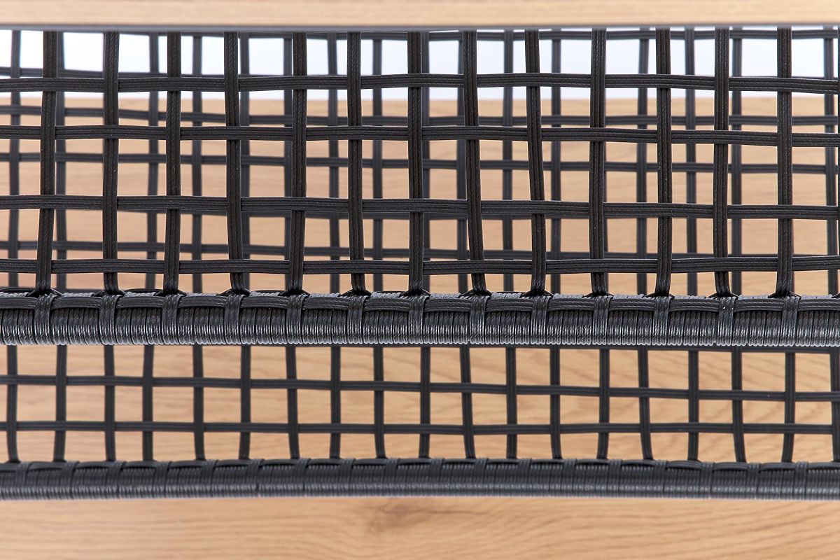 A polcok laminált MDF lapból készültek arany tölgy színben és szintetikus rattanból. A szerkezet fekete színű, porszórt acélból készült.