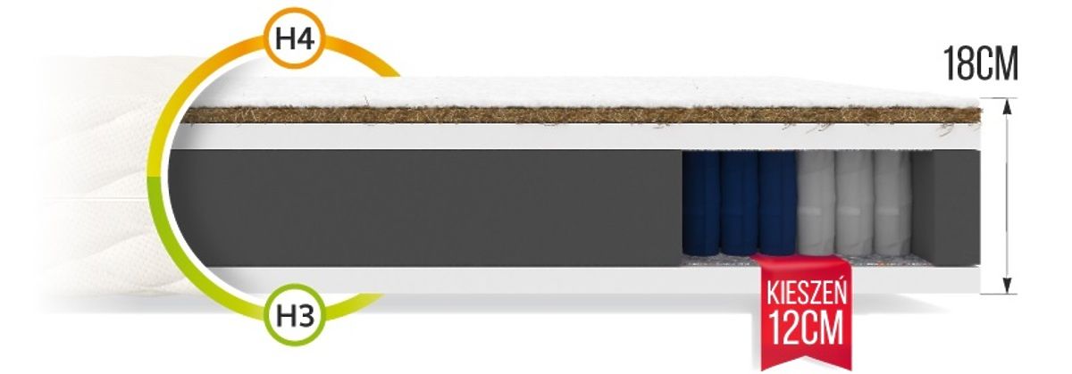A matrac magja zsebrugókból áll, amelyek mindegyike egy speciális zsebben van elhelyezve. A rugók nincsenek összekapcsolva, és terhelés alatt egymástól függetlenül működnek. Formájával alkalmazkodik az alvó ember alakjához, így kiváló tartást biztosít a gerincnek . A matrac 7 támasztózónára van osztva, ahol mindegyik zóna megfelelő támasztást jelent egy adott testrész számára. A FAMILY egy kétoldalas modell a matrac két oldalán található különböző keménységi fokoknak köszönhetően, így könnyen adaptálható az Ön személyes preferenciáihoz. A matrac egyik oldala purhabból és kókusz betétből áll, a másik oldalon pedig purhab réteg található. A rugalmas hab ellenáll a deformációnak és megakadályozza az atkák és más mikroorganizmusok kifejlődését . A természetes kókuszdió lélegző és antiallergén tulajdonságokkal rendelkezik. A rugók és a hab közé elválasztó anyagot helyeztek. Ez egy természetes filc, amely jelentősen meghosszabbíthatja a matrac élettartamát és megerősítheti annak szerkezetét. A felhasznált anyagok biztonságosak, tartósak és kopásállóak. Ennek eredményeként a FAMILY matrac hosszú évekig fog szolgálni.
