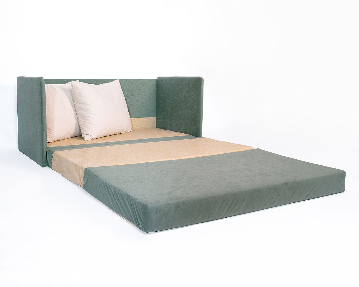 Kinyitható kanapé gyerekszobába, sötétzöld színben, bézs párnákkal. .. többet