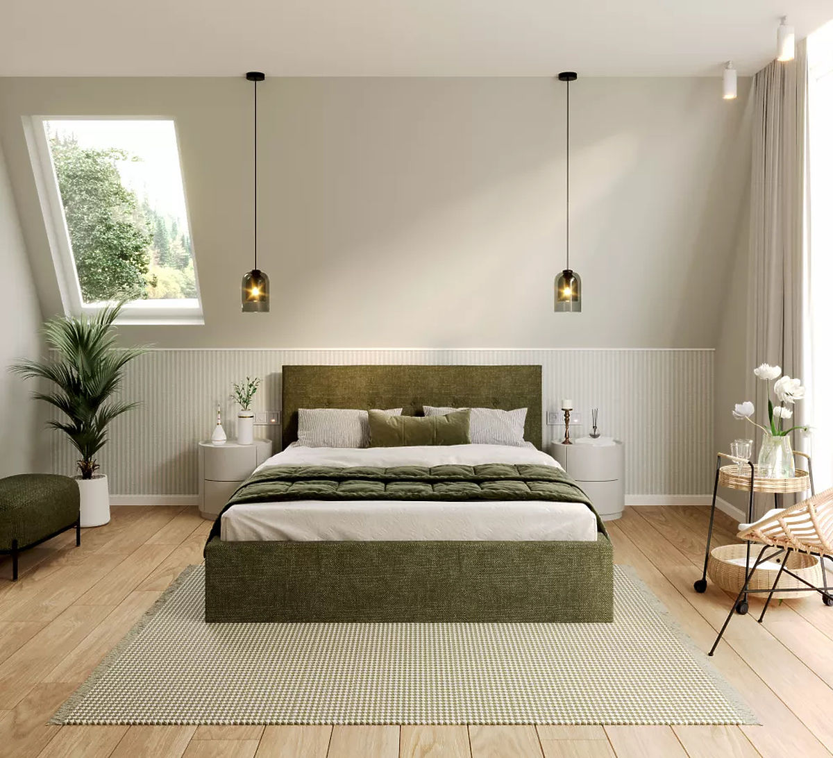 Kárpitozott TULSA ágy 140 x 200 cm- es olíva zöld színben. Ez az ágy a gyönyörű dizájnt a kényelemmel és a praktikummal ötvözi. A kárpitozott fejtámla lágyságot és eleganciát kölcsönöz a helyiségnek, harmonikus és kellemes megjelenést teremtve. Az ideális 140 x 200 cm-es méretnek köszönhetően az ágy elegendő helyet biztosít két személy kényelmes alvásához. Az olívazöld színt gyakran a nyugalomhoz, a stabilitáshoz és a természethez kötik, így a belső terek kedvelt választása, különösen, ha kellemes és megnyugtató érzést szeretnél hozni a helyiségbe.