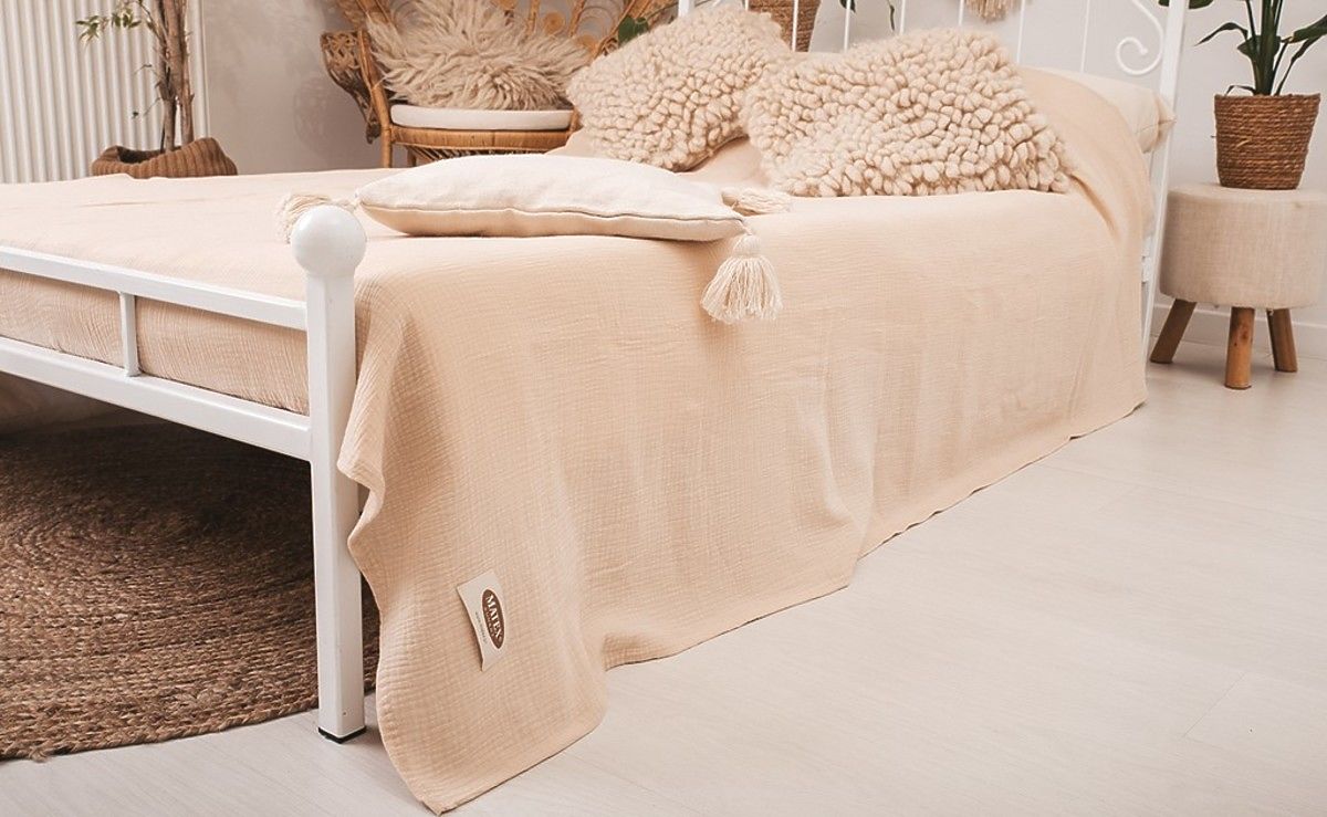 Muszlin ágytakaró 240x210 cm. Könnyű, kellemes és puha tapintású. Kiváló légáteresztő képességgel és hőmérsékletszabályozási képességgel rendelkezik. Nem igényel vasalást, mindig esztétikus hatást kelt, és hangulatos megjelenést kölcsönöz a hálószobának.