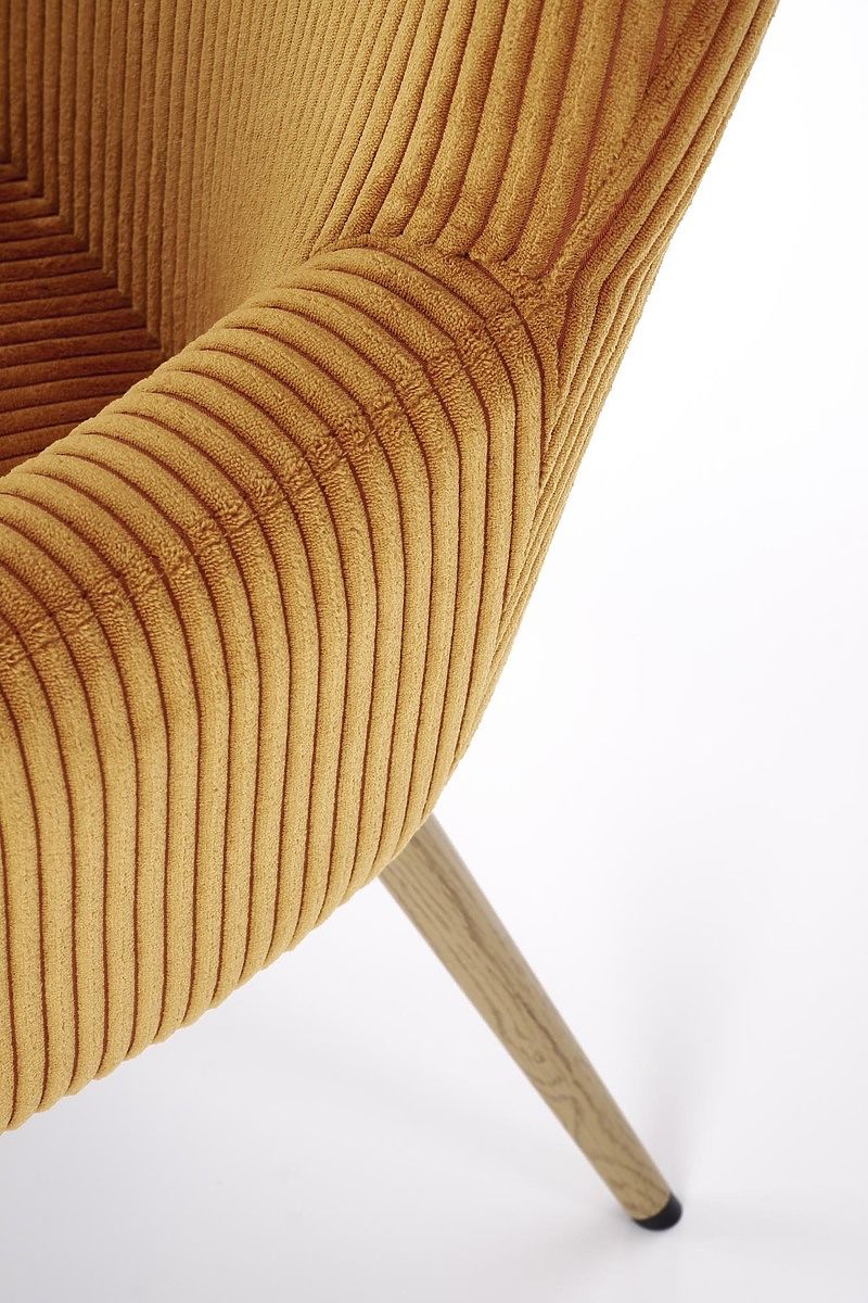 Az eredeti mustárszínű kordbársony puha és egyben kifinomult megjelenést kölcsönöz a széknek. Ez az anyag nemcsak kellemes tapintású, hanem tartós és könnyen karbantartható is, így hosszú élettartamot biztosít a széknek.