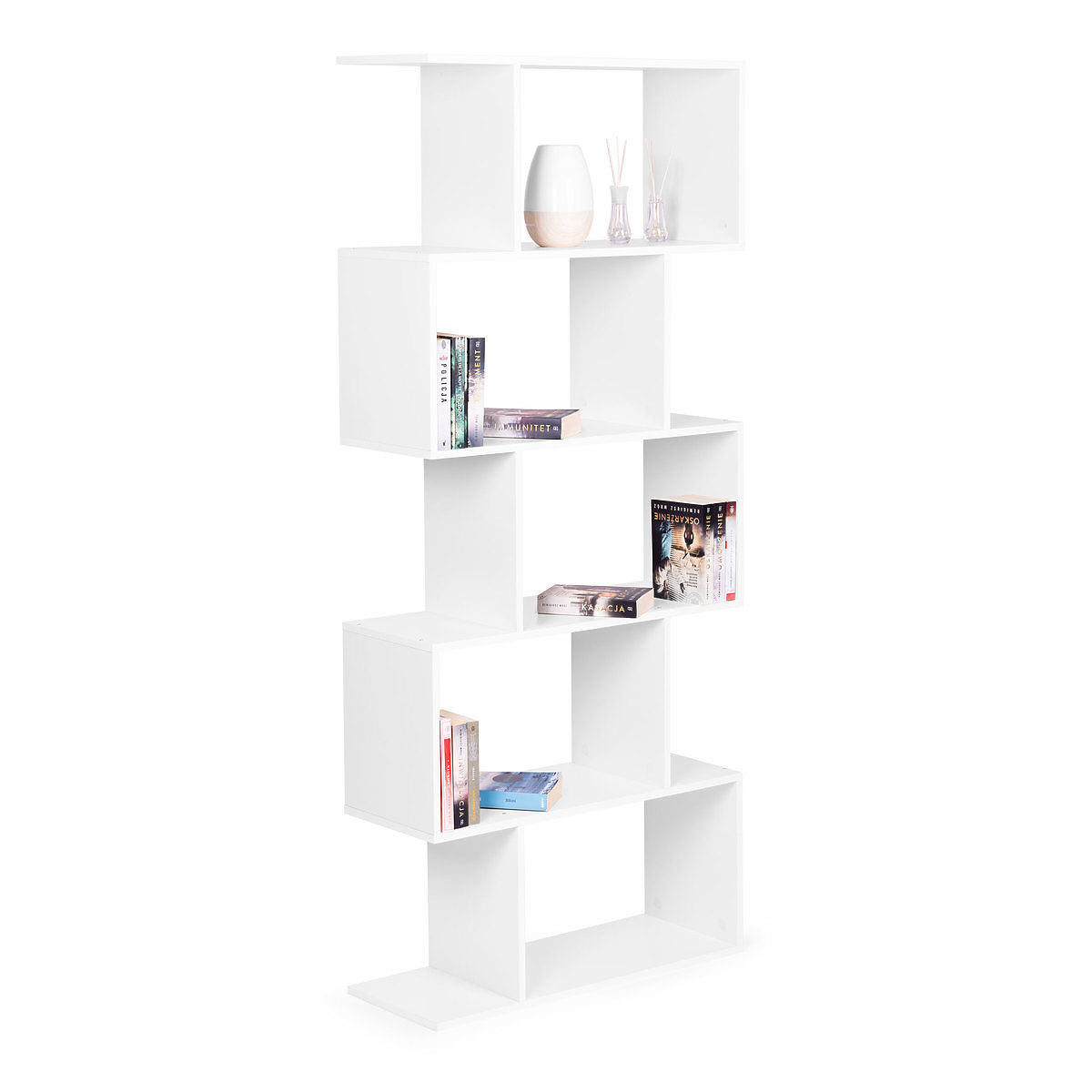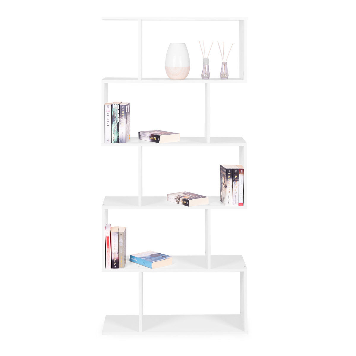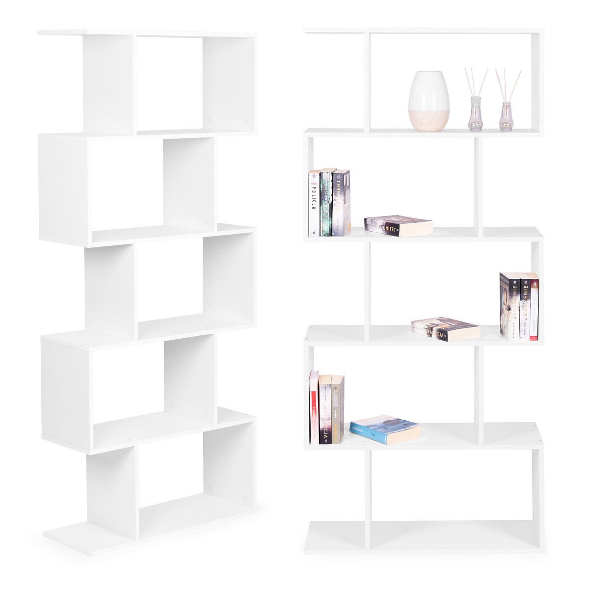 Modern fehér polc 5 polccal könyvekhez és apróságokhoz. .. többet
