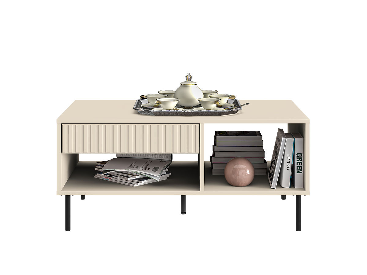 A bézs színű Sophie dohányzóasztal az elegancia és a funkcionalitás tökéletes kombinációja, amely azonnal felpezsdíti nappaliját vagy dolgozószobáját. A bútor érdekes eleme a modern mart fiók és a magas, fekete fém lábak. Az asztal kiváló minőségű anyagokból készült, és a nagy tárolóhelynek köszönhetően nagyon praktikus.