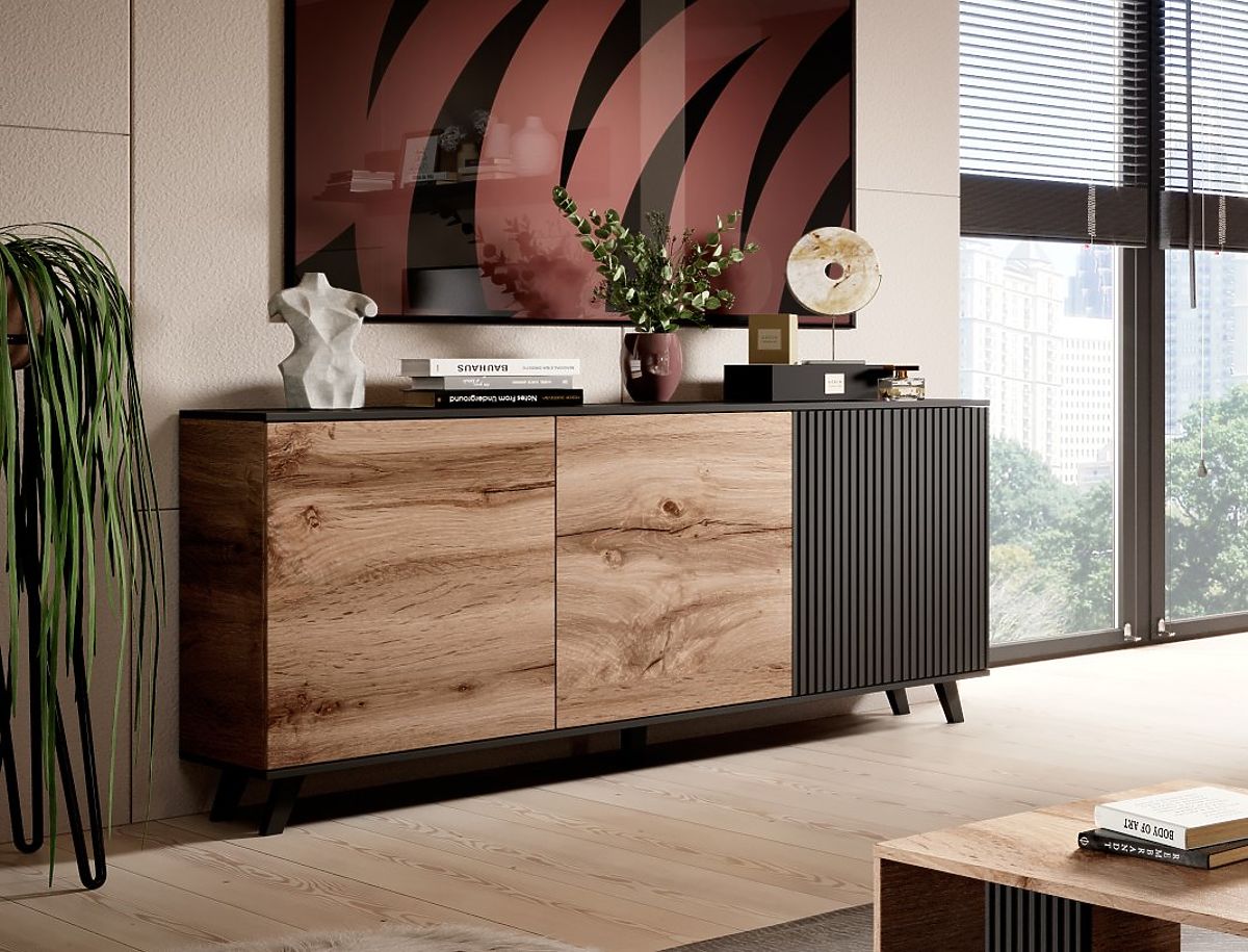 Kiváló minőségű anyagokból, mint például furnérozott MDF és bútorlap, készült komód ötvözi az esztétikát és a funkcionalitást. A Wotan tölgy árnyalatú felület természetes és meleg megjelenést kölcsönöz, míg a fekete elemek modern és kifinomult hatást adnak.