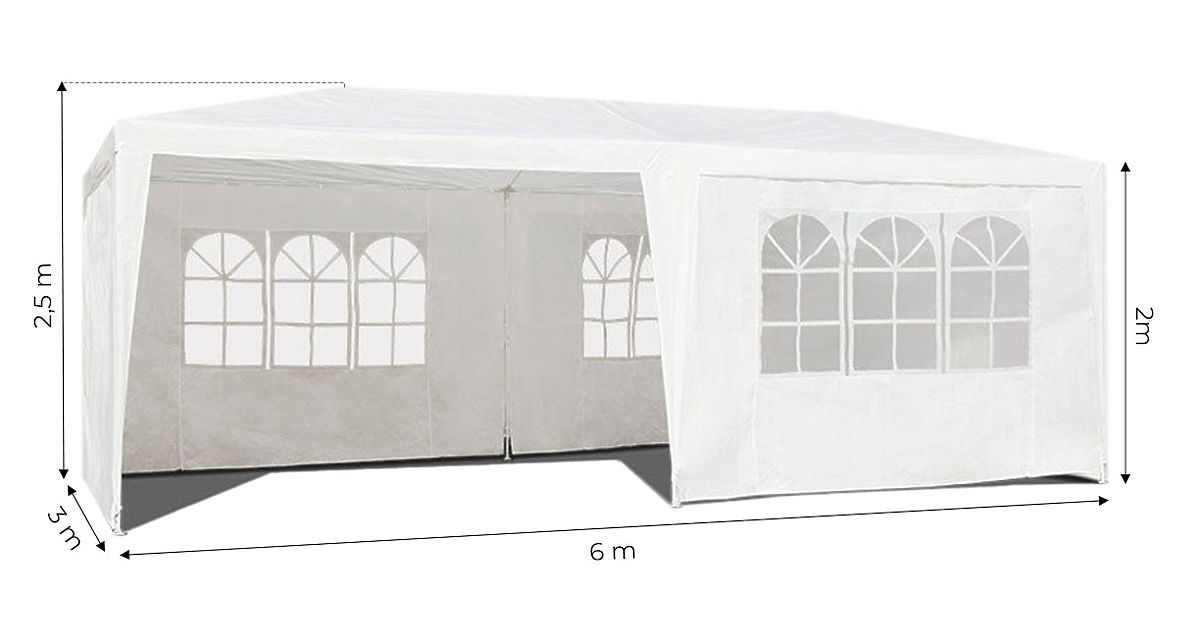 TARTÓS SZERKEZETA sátor váza erős, porfestett fémcsövekből készült, 32/25/25 mm átmérővel, ami biztosítja a stabilitást és a korrózióállóságot. A szilárd szerkezet tartósságot garantál még intenzív használat esetén is. A sátor minden lába cövekekkel van rögzítve a földhöz, ami növeli a stabilitását. A tető és a falak tartós, időjárásálló polietilénből készültek, 100 g/m2 súlyúak, elegáns fehér színben.