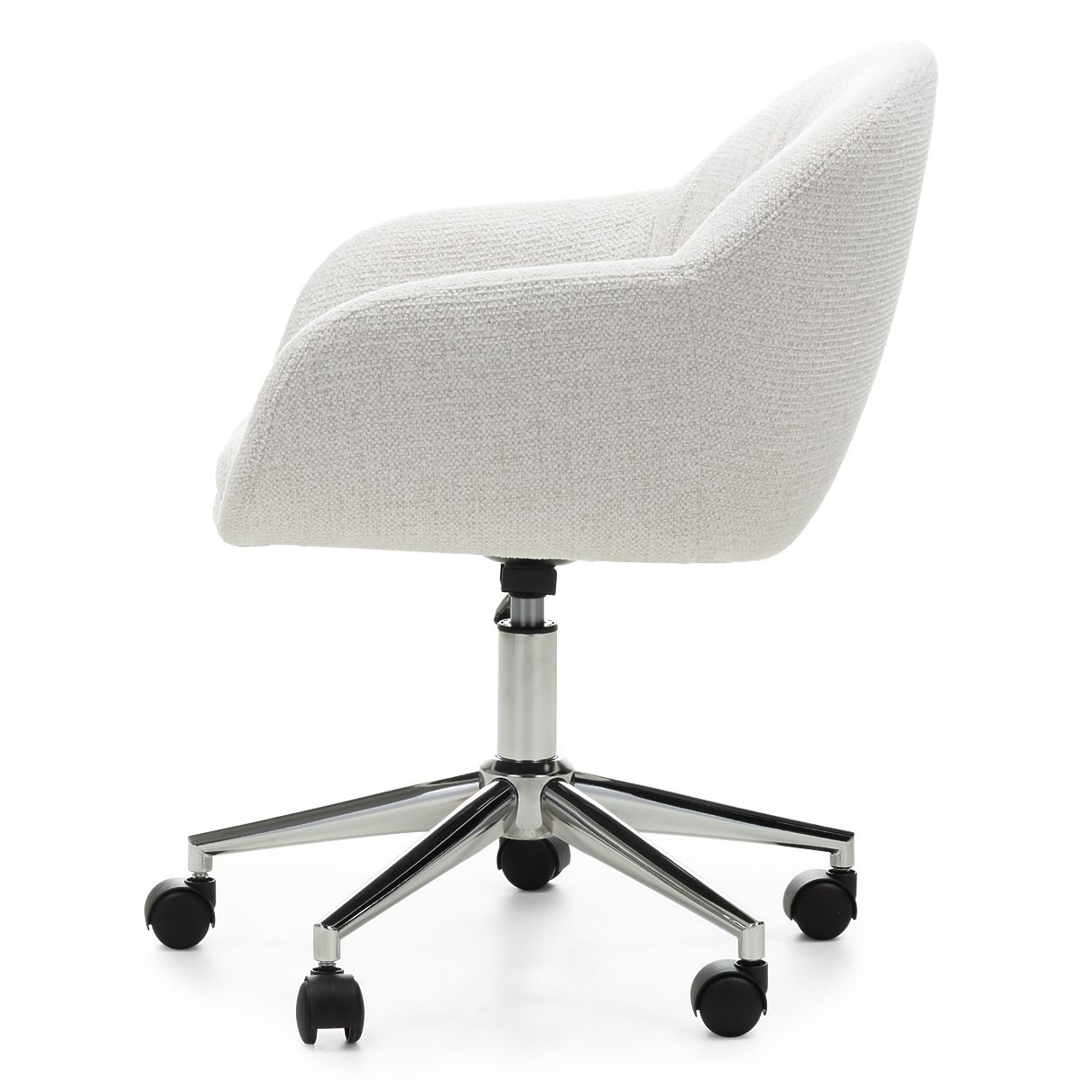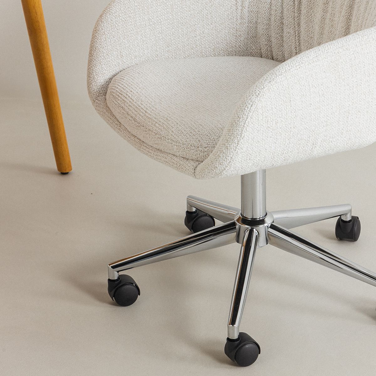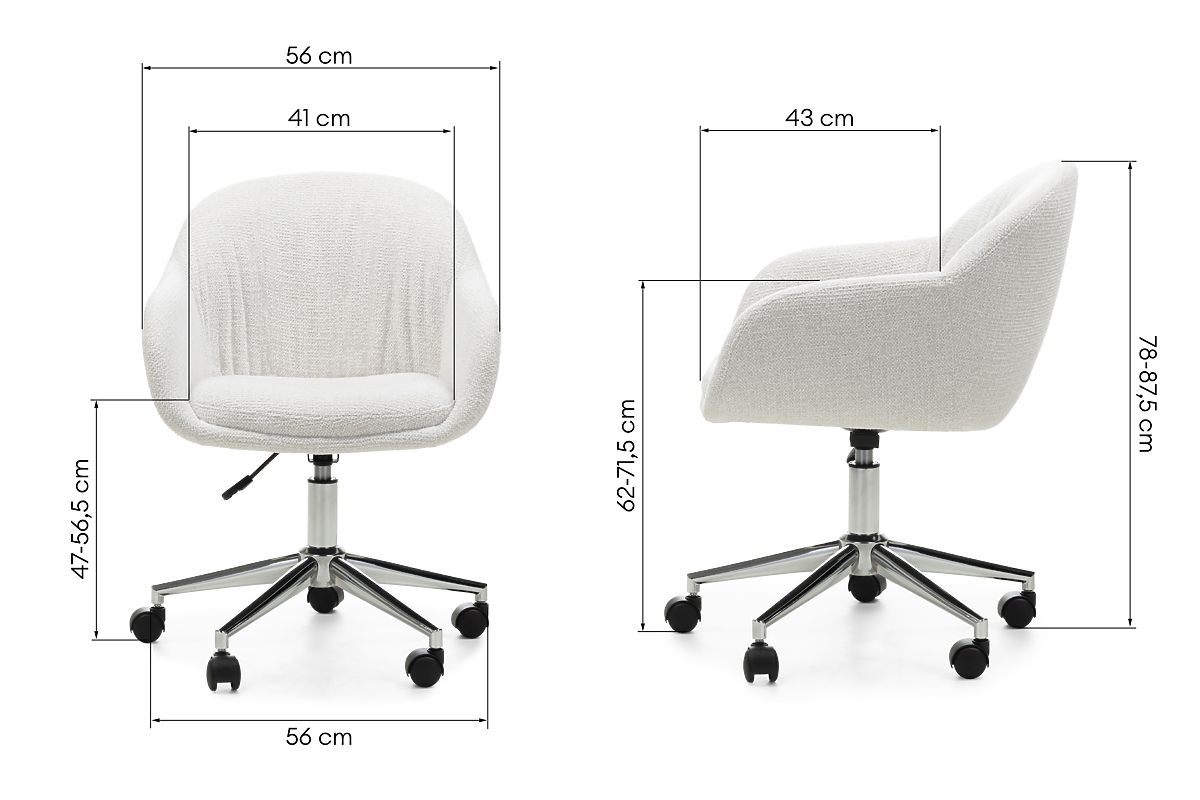 Oti forgószék – stílusos kiegészítő az irodájába, fésülködőasztalához vagy otthoni dolgozószobájába, amely az eleganciát a funkcionalitással ötvözi. A finom krémszínű kárpitozás könnyedséget és harmóniát hoz a belső térbe, tökéletesen illeszkedik a modern dizájnhoz. A krómozott, kerekes lábak kifinomultságot kölcsönöznek az egésznek, miközben teljes mobilitást és mozgásszabadságot biztosítanak. A finoman hajtogatott háttámla és a kényelmes karfák biztosítják, hogy minden pillanat valódi pihenéssé váljon. Az állítható magasság és a 360°-os forgó funkció maximális szabadságot garantál. Legyen szó munkáról, alkotásról vagy pihenésről – az Oti gondoskodik a kényelméről. Válassza ki azt a széket, amely kiemeli stílusát és a mindennapi feladatokat élvezetté teszi.