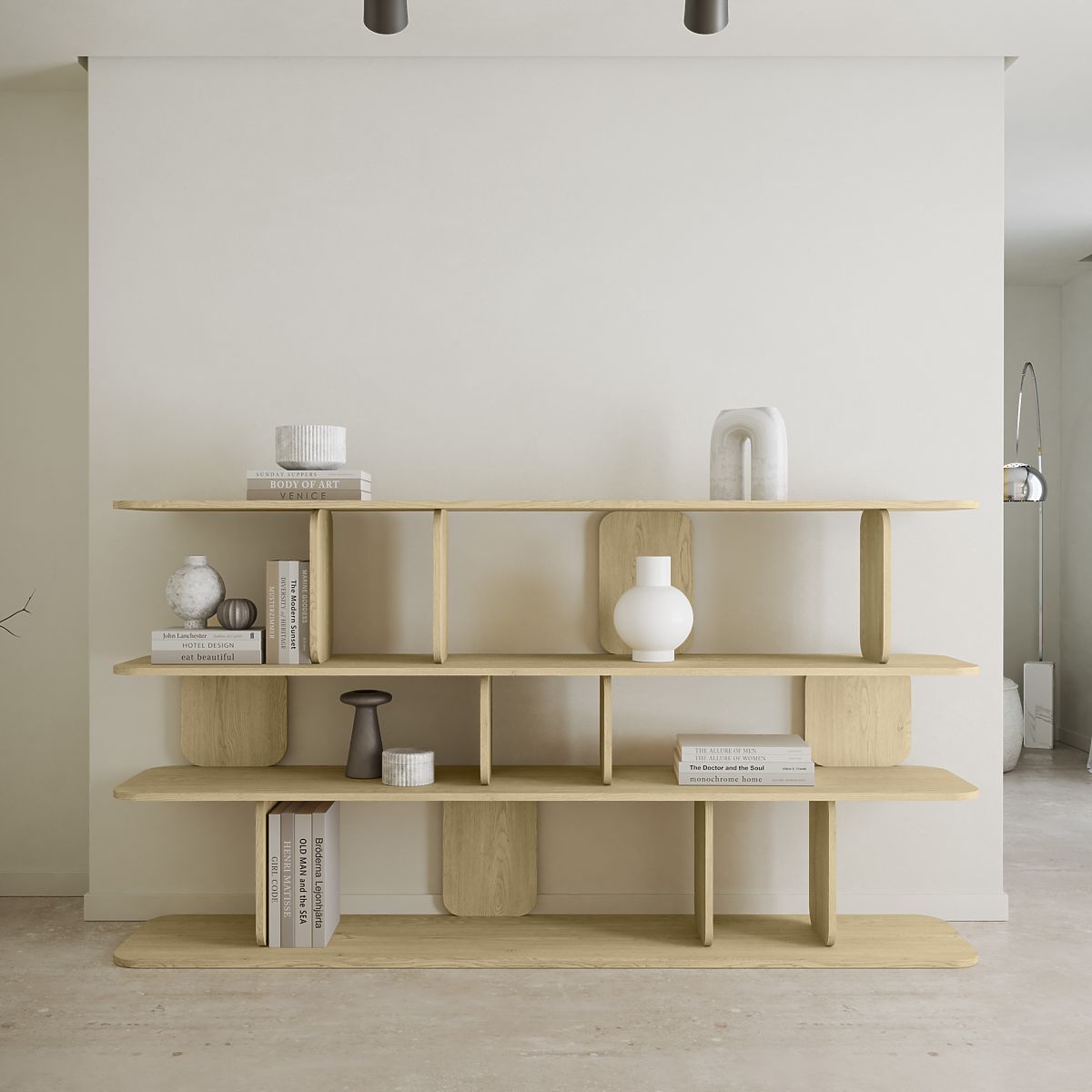 A Tulumo polc már első pillantásra elbűvöl. Modern formája lekerekített vonalakon és geometriai harmónián alapul, amelyek esztétikájukkal és kiegyensúlyozott kompozíciójukkal vonzzák a figyelmet. A 4 szintes szerkezet függőlegesen változatosan elhelyezett rekeszekkel nemcsak érdekes vizuális hatást kelt, hanem stabilitást és praktikus használatot is biztosít. A Tulumo egy olyan polc, amelyet azok számára terveztek, akik értékelik a jó dizájnt és a rendet modern megközelítésben. Minden polc helyet biztosít kedvenc könyvek, dekorációk vagy mindennapi apróságok kiállítására - káosz nélkül, de stílusérzékkel. Tökéletesen illik a nappaliba, otthoni irodába vagy hálószobába, ahol elegáns hangsúlyt és vizuális könnyedséget hoz.