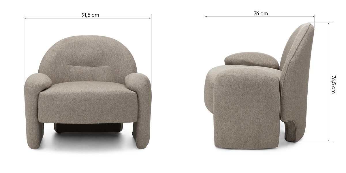 A fotel kárpitozása boucle anyagból készült, finom bézs és szürke árnyalatokban. A szálak szövése finom melírt hoz létre, amely mélységet és kifejezőerőt ad az anyagnak, valamint univerzális jelleget, amely lehetővé teszi, hogy a fotel könnyen alkalmazkodjon a különböző belső stílusokhoz. A lekerekített karfák ölelésbe vonják Önt, ideális feltételeket teremtve könyvolvasáshoz, filmnézéshez vagy egyszerűen csak lustálkodáshoz.