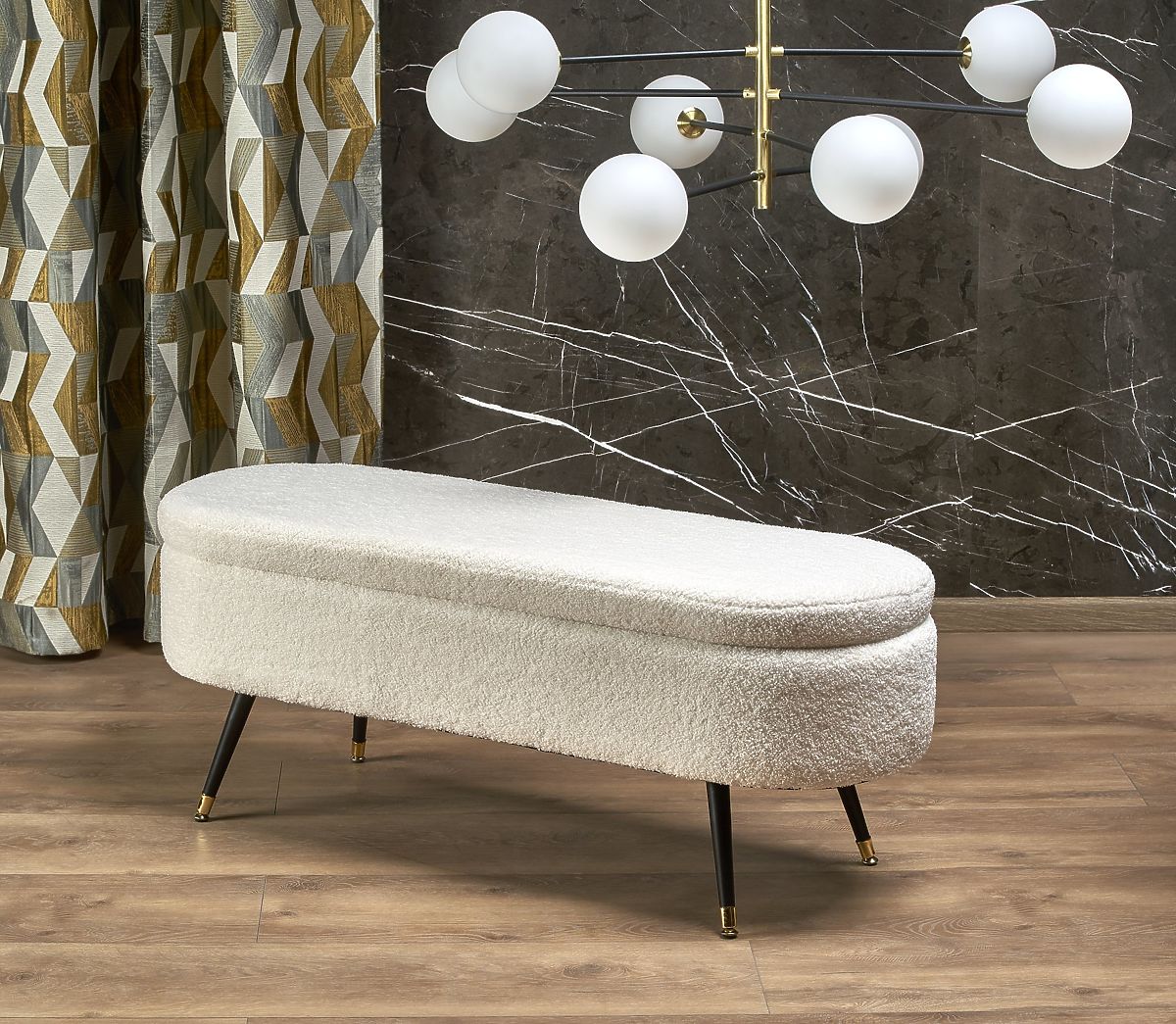 AVEIRO pad ideális módja annak, hogy stílusosan bővítse az ülőhelyet, miközben értékes tárolóhelyet is nyer. Modern, finom krém színű kialakításával eleganciát és otthonosságot kölcsönöz a belső térnek. Tökéletesen kiegészíti a hálószobát az ágy mellett, kiváló kiegészítője lehet a nappali kanapéjának, és praktikus megoldást nyújt az előszobában is. Az ülőfelület buklé szövettel van bevonva, amely finom báránygyapjúra emlékeztet. Ez a puha, meleg anyag minden ülést kellemes és kényelmes élménnyé varázsol. A pad stílusos és egyben otthonos – ideális modern, skandináv vagy minimalista enteriőrökbe. Az AVEIRO pad felbecsülhetetlen előnye a praktikus tárolóhely, amely a dugattyúkkal rögzített felnyitható fedél alatt található. Itt elférnek ruhák, kiegészítők, textíliák vagy más apróságok, amelyeket mindig kéznél szeretne tartani, de nem szem előtt.