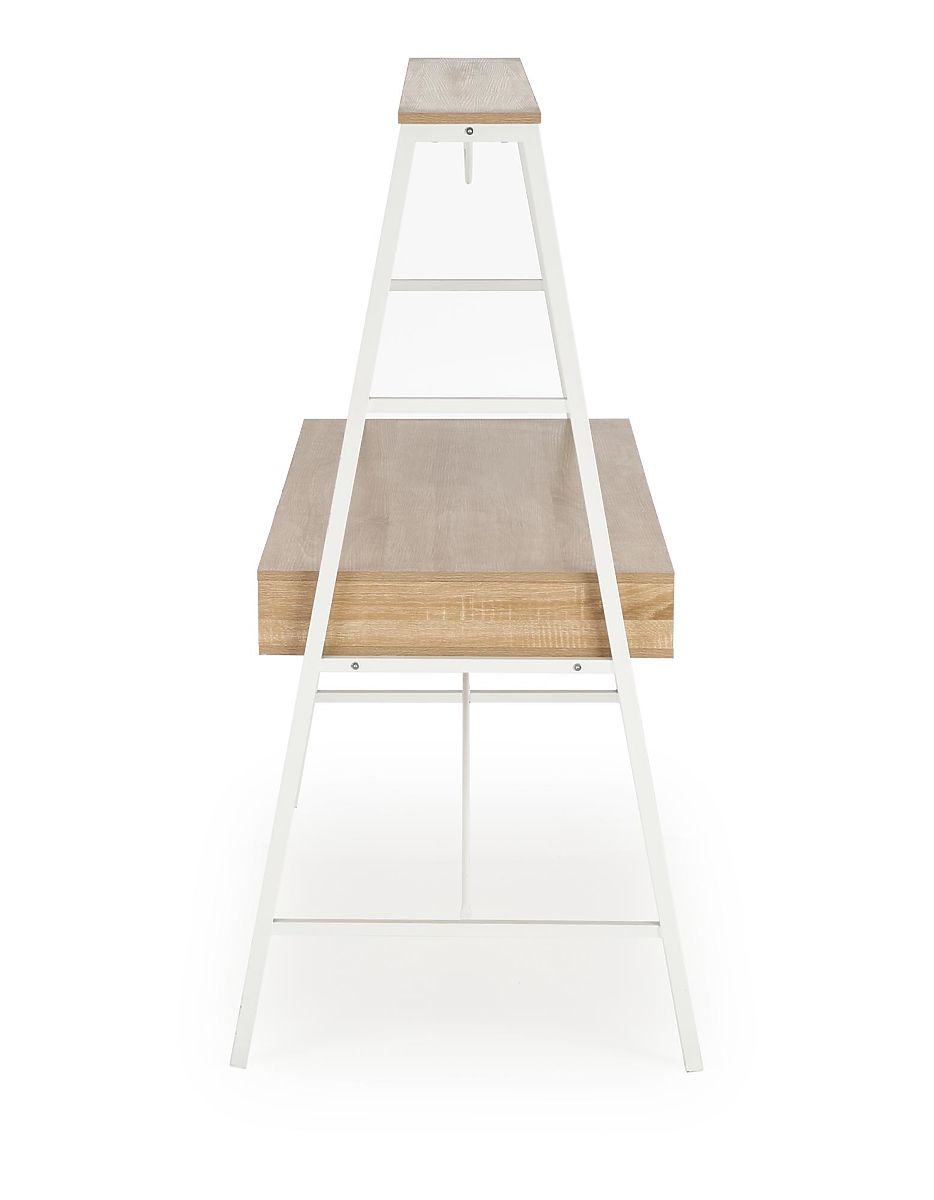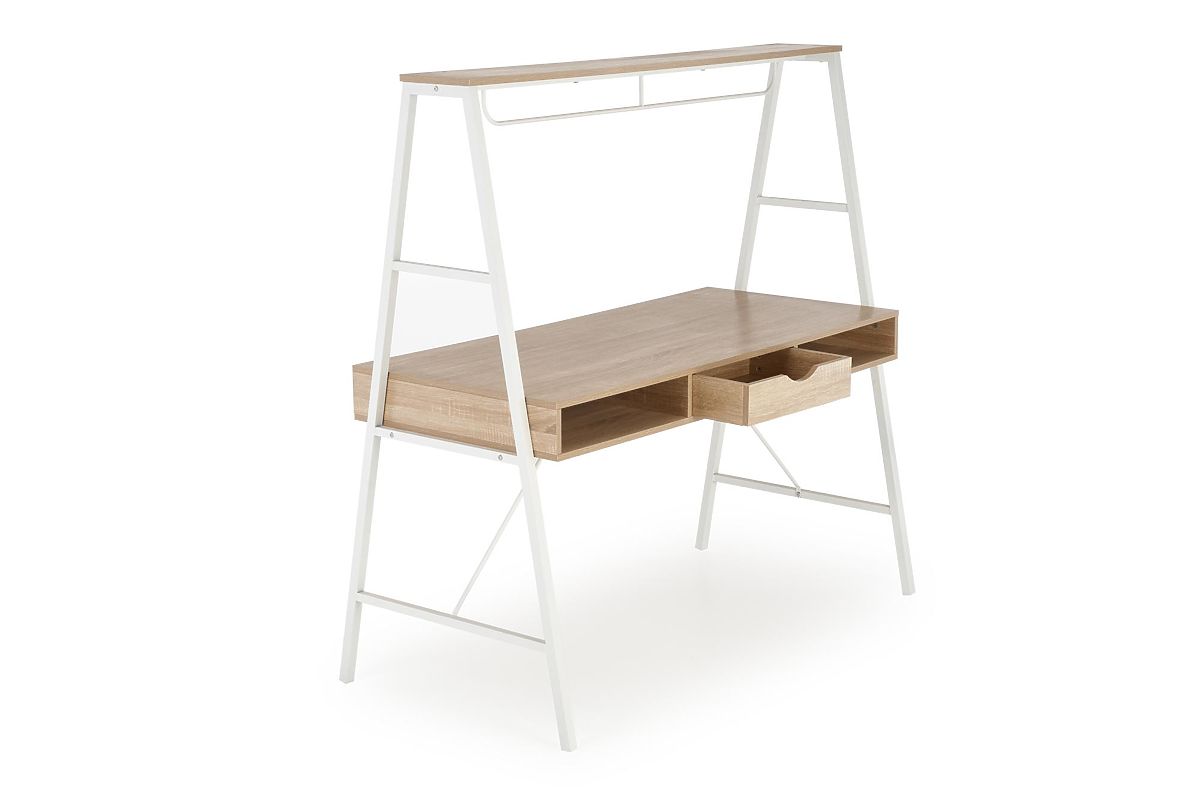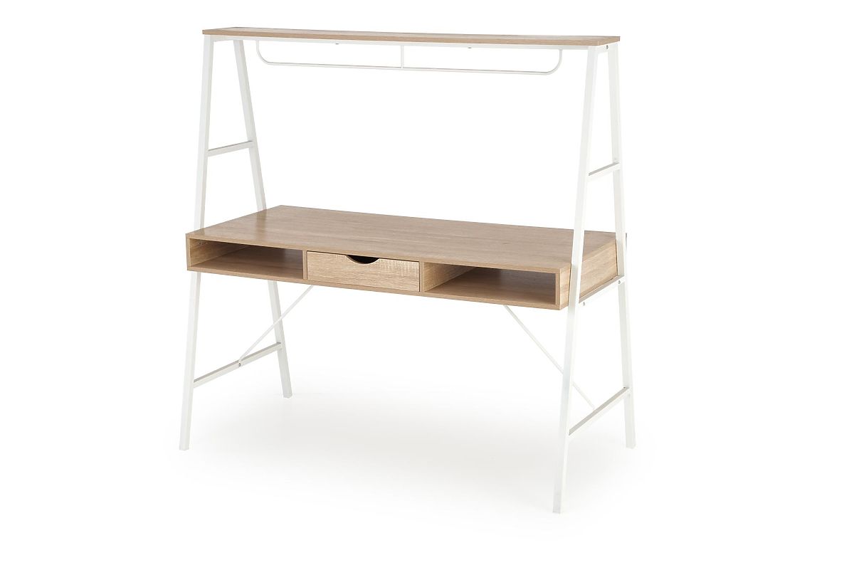 Ez a modern íróasztal kiváló választás otthoni irodába, irodába, gyerek- vagy diákszobába. Funkcionalitást, tartósságot és stílusos designt egyesít a kellemes világos fa dekorációval, amelyet fehér elemek egészítenek ki. A munkafelület elegendő helyet kínál számítógépes munkához, tanuláshoz vagy dokumentumok rendezéséhez. Az asztal praktikus tároló részekkel van felszerelve, amelyek segítenek a munkaterület rendezettségének megőrzésében. Az elülső részek kiváló minőségű matt MDF-ből készültek, míg a stabil vázat erős fém szerkezet alkotja, szintén matt kivitelben. A univerzális elhelyezésének köszönhetően könnyen elhelyezhető különböző típusú helyiségekben, és harmonizál a modern belső terekkel.