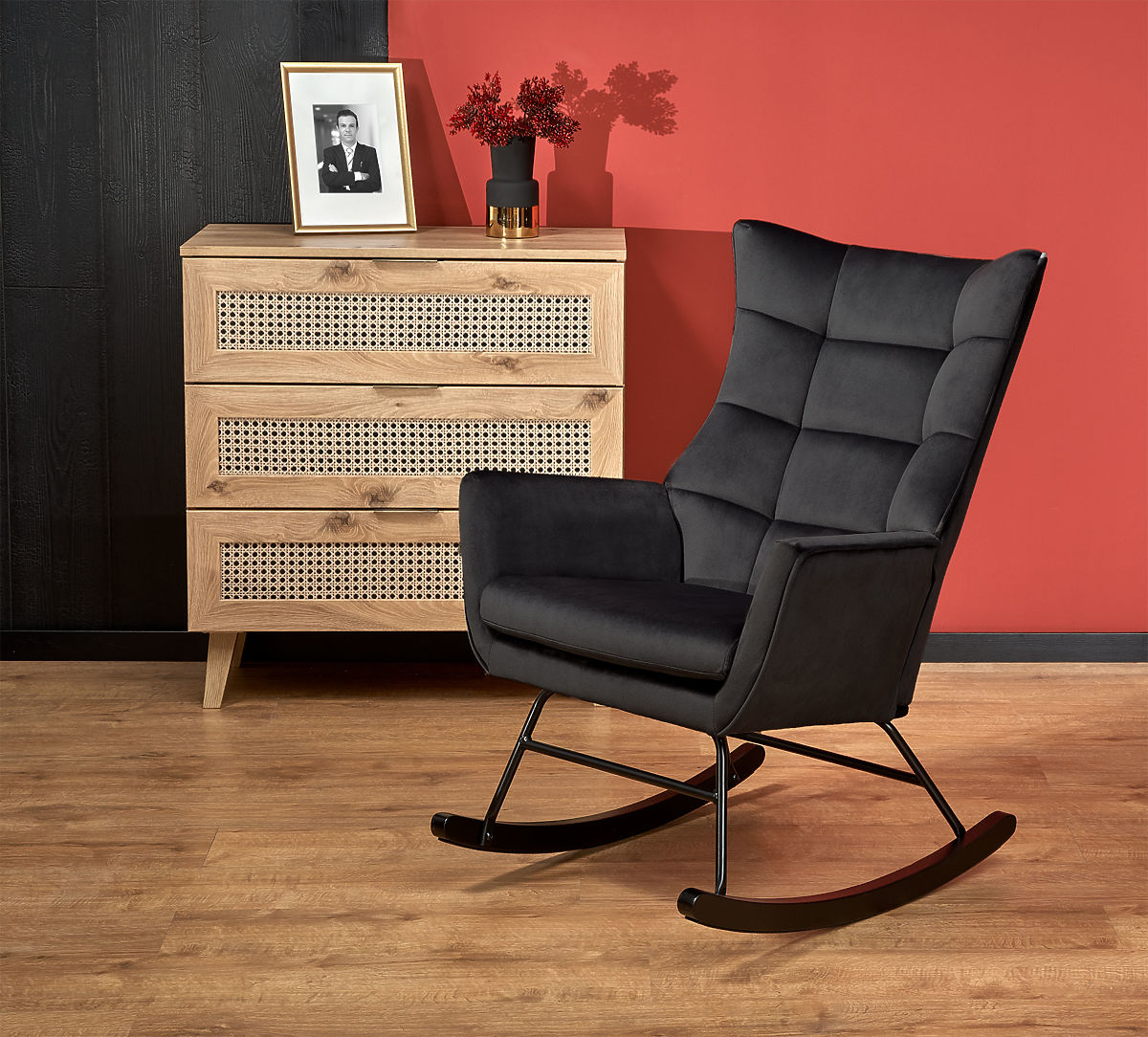 Fekete bársony hintaszék acél és fa kerettel. .. többet
