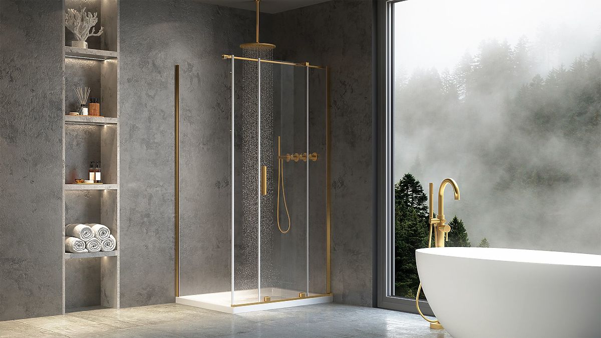 Montana zuhanykabin arany akcentusokkal és Easy Clean bevonattal. .. többet