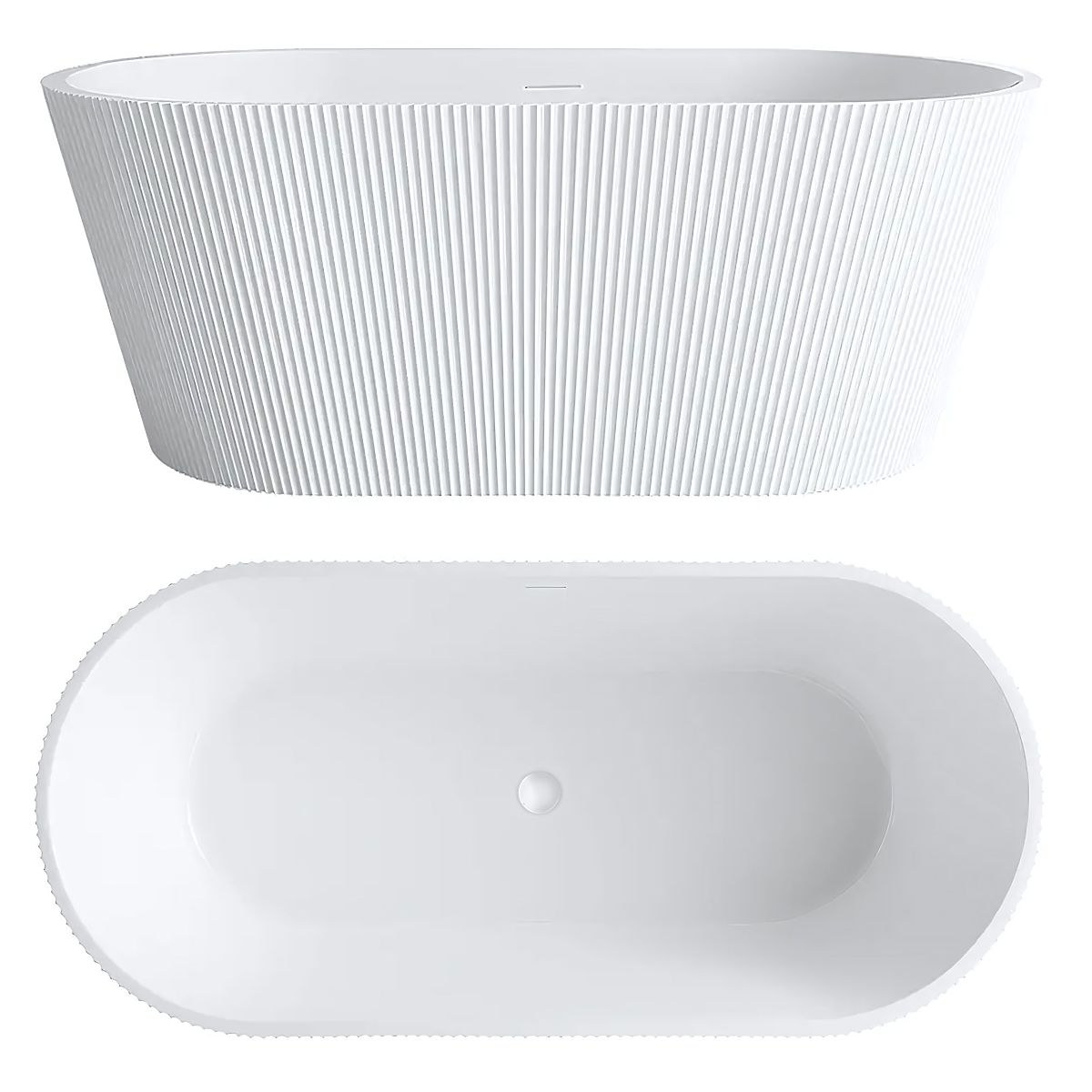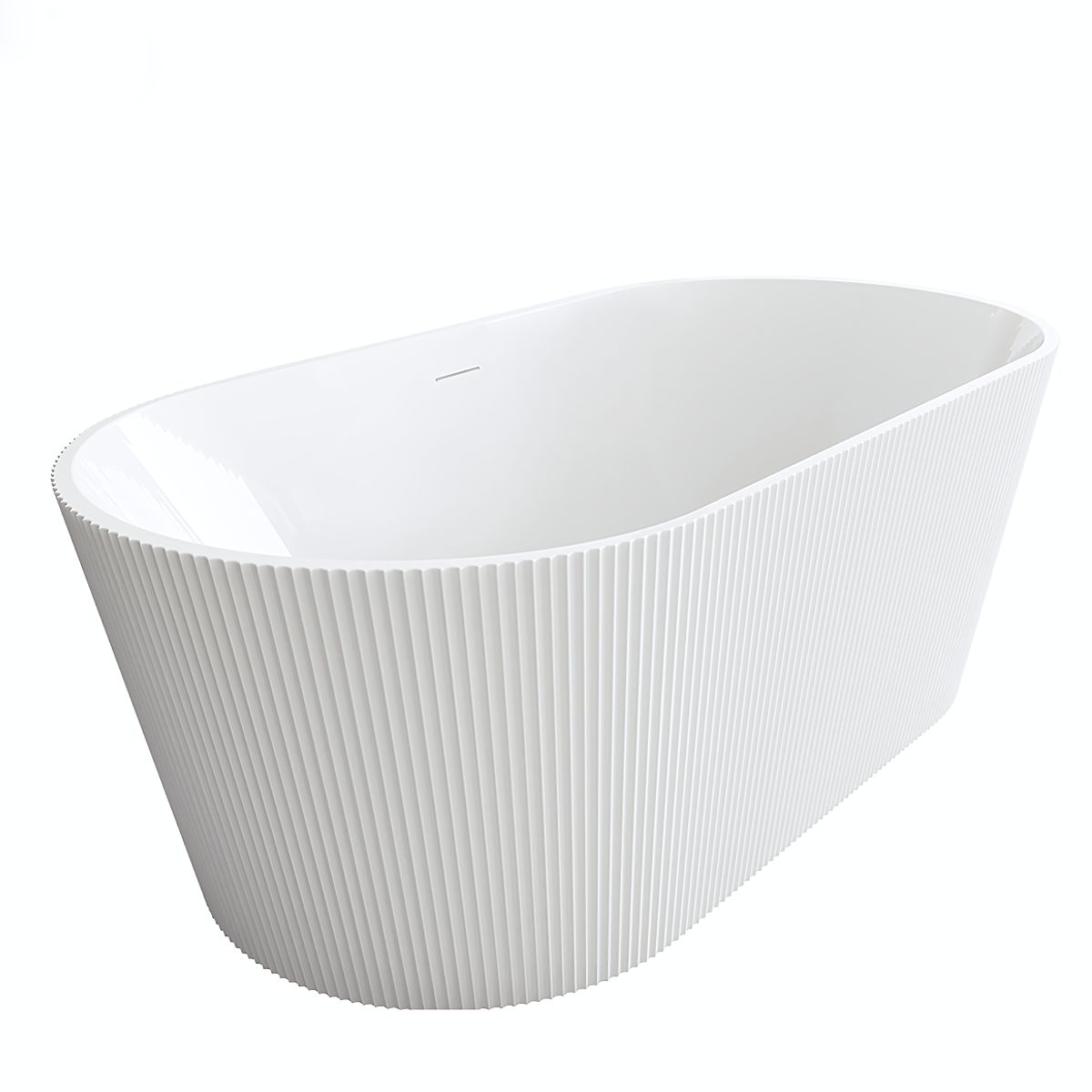 Szabadon álló kialakításának köszönhetően az Ofelia kád bárhol elhelyezhető a fürdőszobában — falnál, sarokban vagy a szoba közepén, elegáns és harmonikus fürdőszobai teret teremtve. A bordázott oldalszerkezet gyönyörűen veri vissza a fényt, mélységet és különleges bájt adva a belső térnek.
