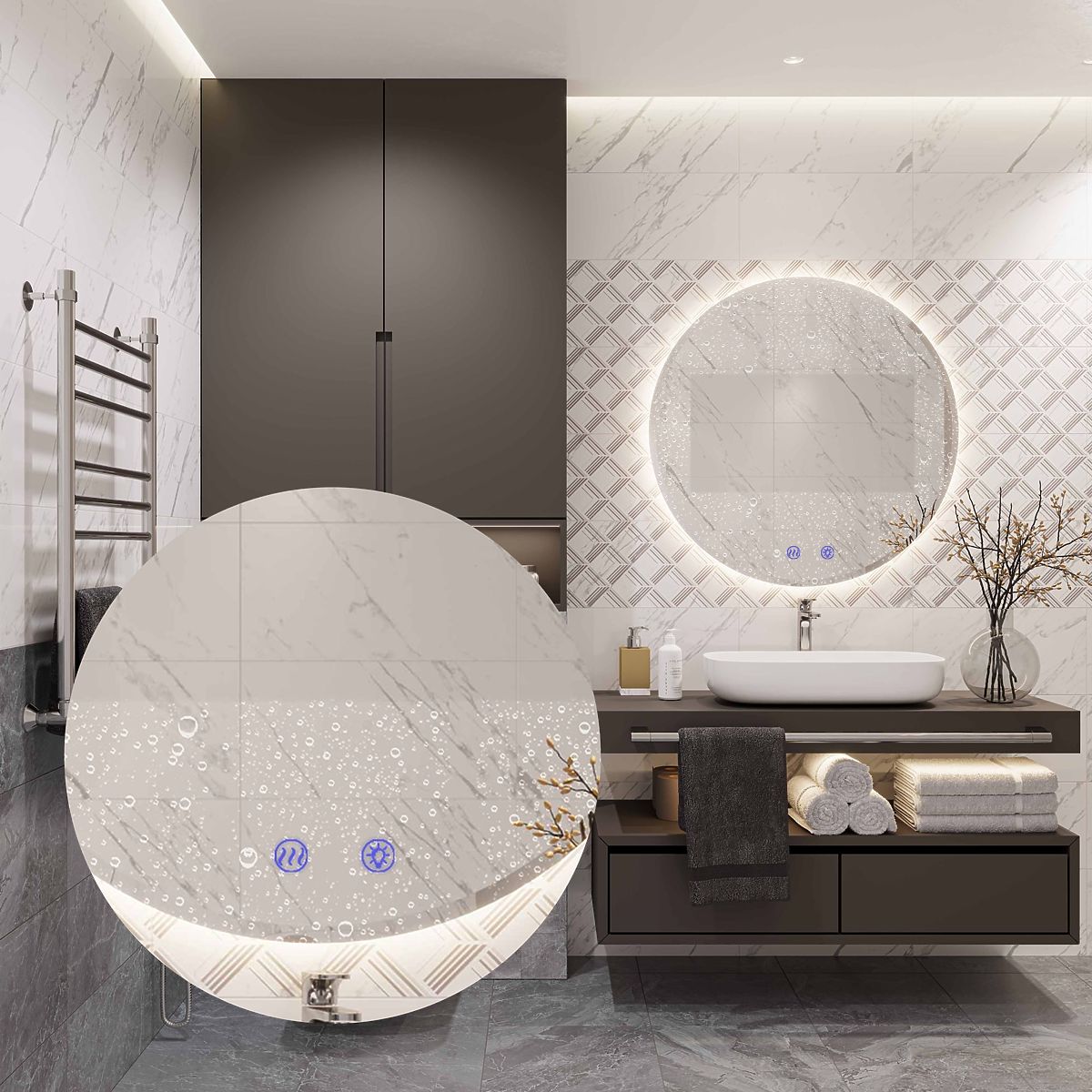 A kerek tükör LED világítással ideális választás azok számára, akik értékelik a használati kényelmet és a modern dizájnt. A tükör a legkiválóbb anyagokból készült, remekül mutat és nagyon tartós. Három érintéssel változtatható LED fény színt kínál – meleg, semleges és hideg –, valamint fűtési funkciót, amely megakadályozza a felület párásodását. Az érintőkapcsoló a tükör felületén található, és a funkció aktiválásakor kék háttérvilágítást kap. Fehér színű tápkábel, hossza 110 cm.