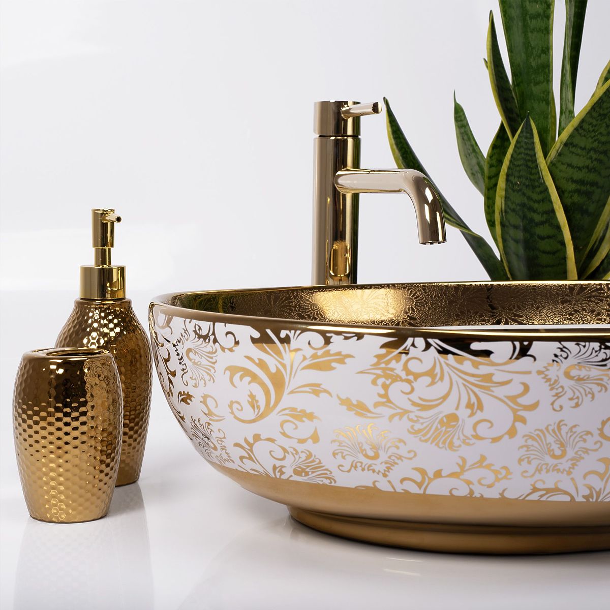 Ez a termék remekül kiegészíti a fürdőszobai teret, megőrizve a belső tér hibátlan megjelenését és esztétikáját. A tálat gyönyörű arany szín fedi növényi motívummal, amely kontrasztot alkot a fehér színnel.