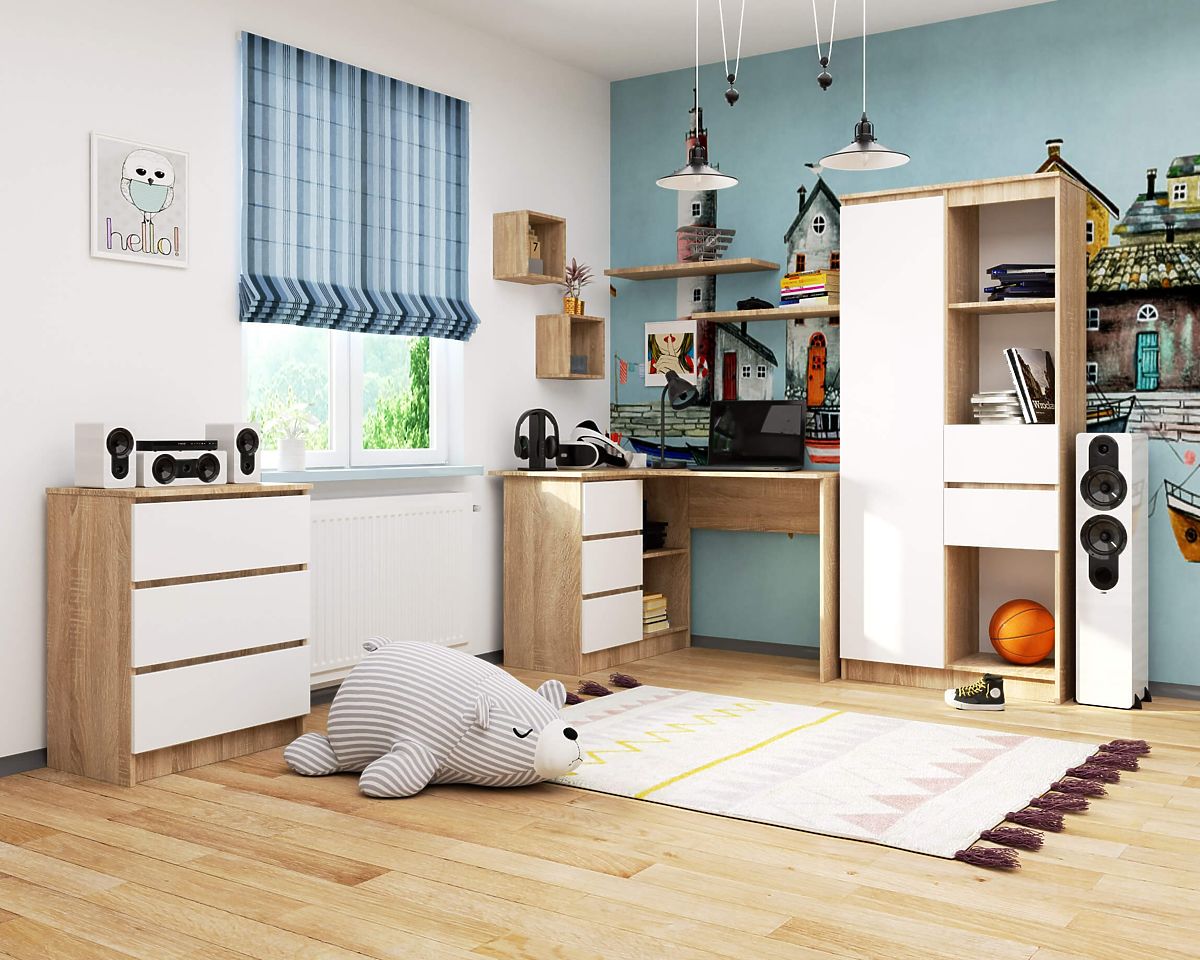 A három fiókkal felszerelt sarok íróasztal érdekes ajánlat azok számára, akik a modern irodai berendezéseket részesítik előnyben. Ez egy finom kombináció a klasszikus fehér és a nagyon divatos tölgy sonoma szín között. A bútor egy íróasztalból, két nyitott szekrényből és fiókokból áll. A bemutatott ajánlat jól illeszkedik minden irodába, ahol fontos a lehető leghatékonyabb térkihasználás. A gyártáshoz 16 milliméter vastag laminált lapot használtak - tartós anyag, amely nagy ellenállást biztosít a sérülésekkel szemben. A sarok számítógépasztal biztosan kielégíti a legigényesebb vásárlókat is, akik számára fontos a megjelenés, a minőség és a funkcionalitás. Meghívjuk Önt, hogy ismerje meg a kollekció további bútorait is - komódokat, polcokat és szekrényeket, amelyek ugyanabban a színkombinációban kaphatók. Ezekkel biztosan sikerül megfelelő teret kialakítani az irodai munkához vagy tanuláshoz - akár otthon, akár az irodában.