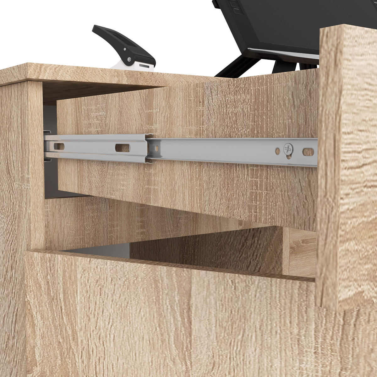 Az asztal sonoma tölgy színben készült, ami nagyon elegáns megjelenést kölcsönöz neki. Szinte bármelyik szoba terébe tökéletesen illeszkedik. Kifejezetten számítógép-felhasználók számára tervezték, ezért rendelkezik billentyűzettartó polccal és szabad fiókokkal, amelyekben fontos tárgyakat, például kábeleket, lemezeket vagy fejhallgatókat lehet tárolni. Az asztal önálló összeszerelésre készült. Azonban a speciális útmutatónak köszönhetően ez nagyon egyszerű. Világosan bemutatja, hogyan kell lépésről lépésre megtenni. Bár a bútor kiváló minőségű anyagokból készült és ellenáll a sérüléseknek, 24 hónapos garanciát kínálunk vásárlóinknak.