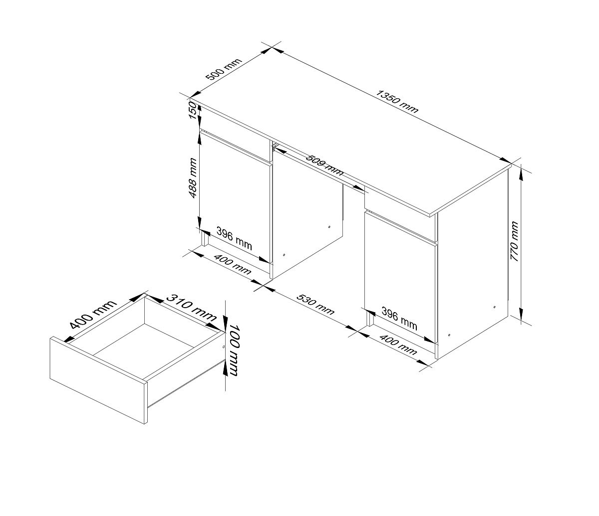 Íróasztal 16 mm vastag, kopásálló laminált lapból.