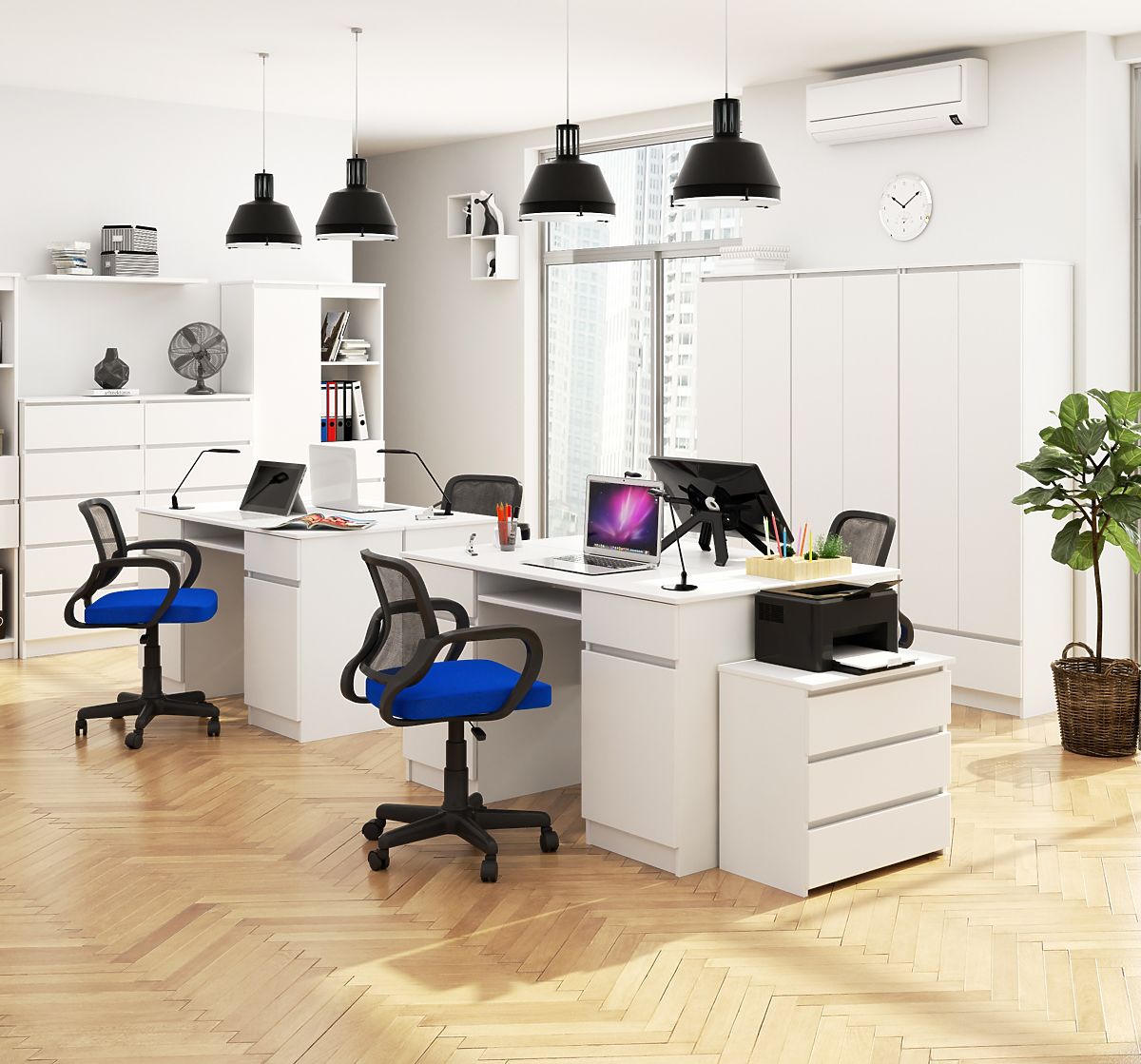 Az A5 íróasztal kiváló minőségű, erős, 16 mm vastag laminált lapból készült. Mind a korpusz, mind a bútor elülső részei divatos és univerzális fehér színben kaphatók. A bútor praktikus billentyűzettartó polccal, két fiókkal és két szekrénnyel van felszerelve, ami jelentős tárolóhelyet biztosít. Az asztallap hossza 135 cm és mélysége 50 cm, így elegendően nagy a monitor, laptop vagy írószerek kényelmes elhelyezéséhez. Ez az asztal tágas és egyben kompakt, mivel magassága 77 cm, és minden fiók és szekrény 40 cm hosszú. Méreteinek és esztétikus, modern megjelenésének köszönhetően ez a modell kiválóan illik mind a diákszobába, mind az irodába.
