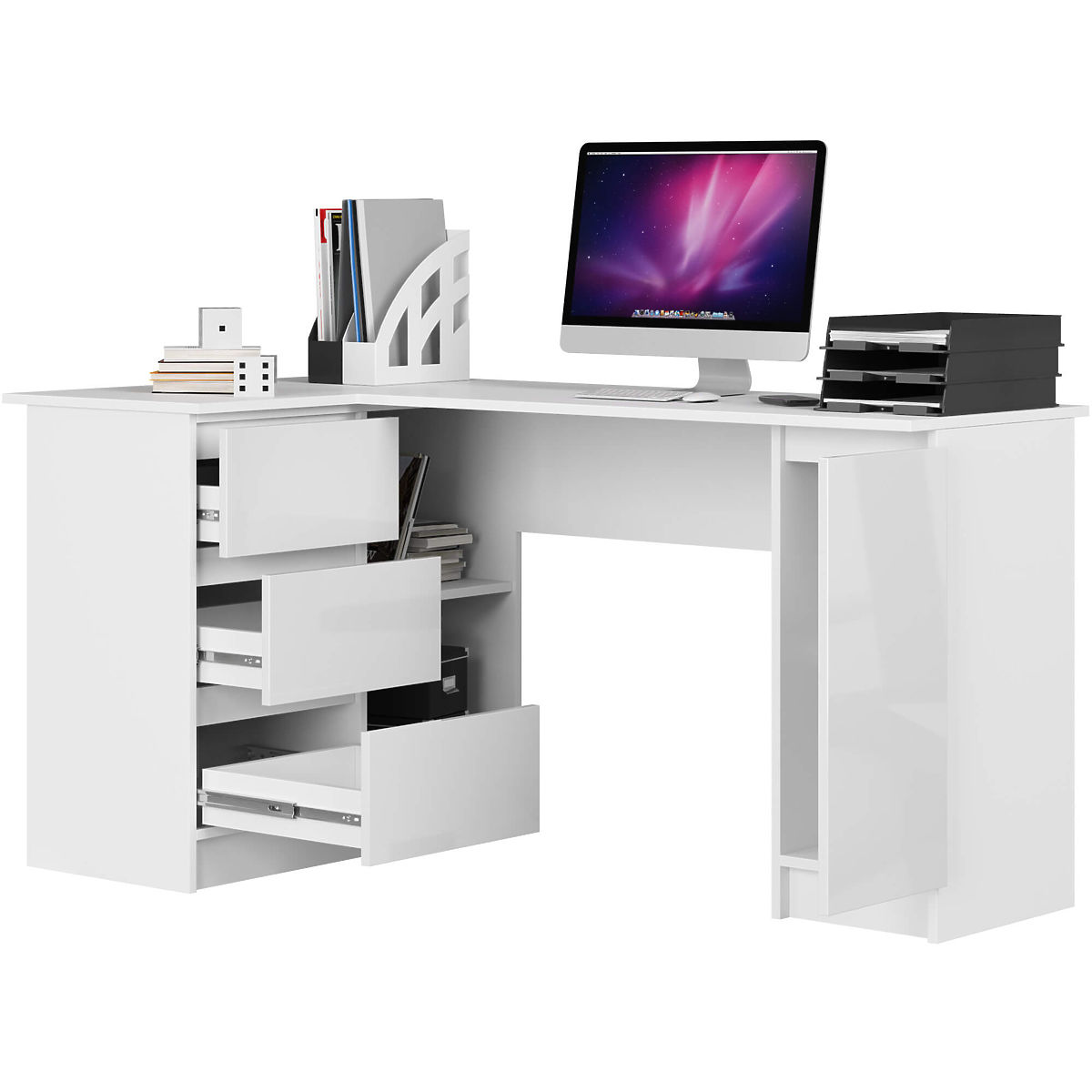 Webáruházunk egyik javaslata a modern stílusú fehér sarokasztal laptophoz. Három golyós fiókkal, két nyitott polccal és egy szekrénnyel rendelkezik. Figyelmet érdemel a nagy asztallap is. A fehér időtlen szín, amely soha nem megy ki a divatból. Ráadásul a fehér remekül kombinálható bármilyen más színnel, pozitívan hat a hangulatra és a munkahatékonyságra. Ezért ez a javaslat nemcsak otthoni irodába illik, hanem segít egy szép, modern irodai tér kialakításában minden vállalatnál. Jó minőségű terméket kínálunk kedvező áron. Vásárlásra invitáljuk.