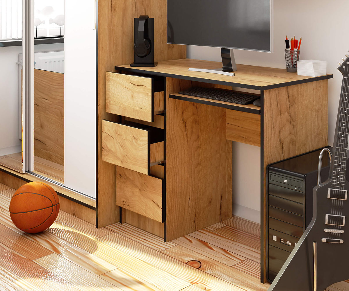 A számítógépasztal lehet funkcionális és egyben elegáns megjelenésű. Példa erre a kínálatunkban található bútor: A-6 90 cm BALOS íróasztal craft tölgy színben, amely valódi fa hatását kelti. Jellemzője a szilárd kidolgozás és a funkcionalitás. Az íróasztal ideális nappaliba, gyerekszobába vagy irodába, megkönnyíti a tanulást és a munkát a számítógép előtt.