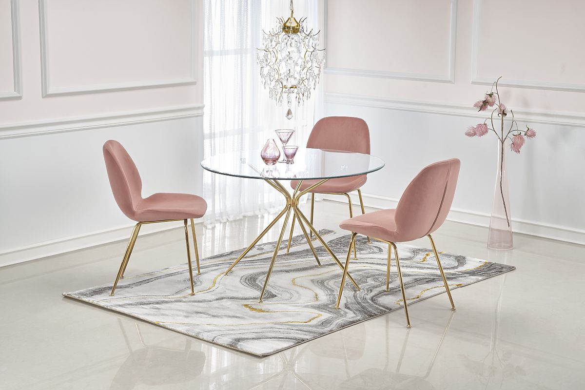 Az Agis étkezőasztal stílusos kiegészítője a modern étkezőknek, ahol könnyed esztétikájával és ötletes kialakításával tűnik ki. A kerek üveglap légies megjelenést kölcsönöz, optikailag nem terheli a teret, és ideális választás kisebb belső terekbe is. A felső lap edzett, átlátszó üvegből készült, amely nemcsak elegáns, hanem nagyon praktikus is – könnyen tisztítható és ellenáll a mindennapi használatnak. Elég egyszerűen letörölni és kifényesíteni, hogy megőrizze tökéletes megjelenését. Az asztal domináns eleme az arany színű fém lábazat, amely eredeti formájával vonzza a tekintetet és luxus érzetet kölcsönöz az egésznek. Ugyanakkor magas stabilitást és szilárdságot biztosít a szerkezetnek. Az asztal kényelmesen 4 főt ültet le, így ideális megoldás mindennapi étkezésekhez és alkalmi összejövetelekhez is.