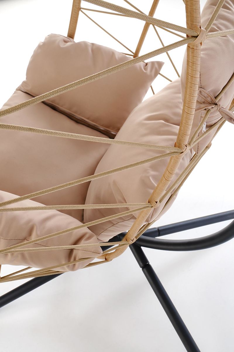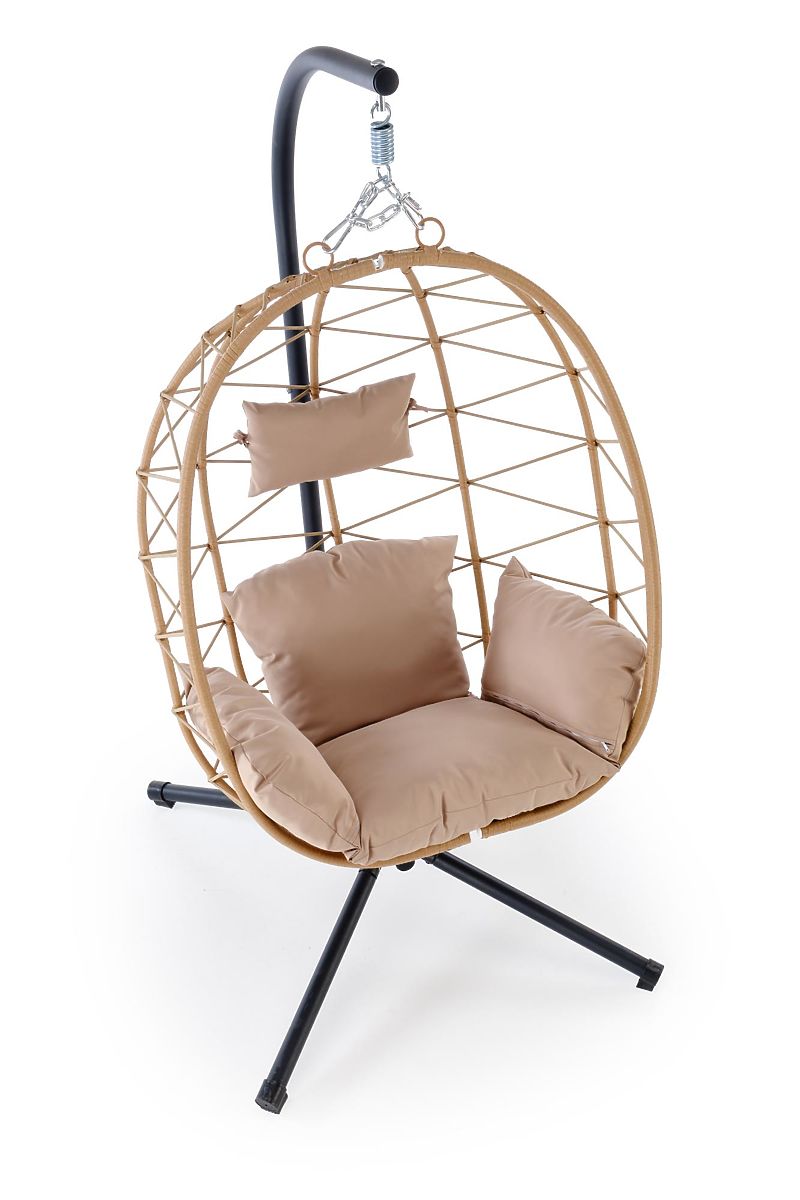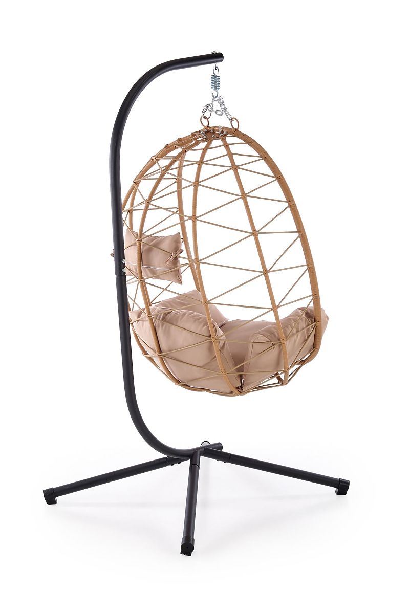 A Snake függőszék egy stílusos relaxációs ülőhely, amely egy személy számára készült, és ideális helyet teremt a kertben, teraszon vagy erkélyen való pihenéshez. Az ölelő kosár formája magánéletet és biztonságérzetet nyújt, míg a finom hintázás hozzájárul a teljes relaxációhoz és ellazuláshoz. Az ergonomikusan formázott kosár magas háttámlával kényelmes ülést biztosít olvasás, beszélgetés vagy rövid pihenés közben. A székhez tartoznak puha párnák, amelyek alátámasztják az ülőfelületet és a hátat, jelentősen növelve a használat kényelmét. A stabilitást egy önállóan álló acélszerkezet biztosítja porfestéssel, így nincs szükség a szék mennyezetre való felfüggesztésére. Ez lehetővé teszi a könnyű áthelyezést az aktuális pihenőzóna igényei szerint. A szerkezet súlya hozzájárul a biztonságos és stabil használathoz. A szék kosara tartós eko-rattanból készült, amely légáteresztő, erős és alkalmas kültéri használatra. A fém elemek hosszú élettartamot és a teljes szerkezet szilárdságát biztosítják, míg a textil párnák otthonos jelleget kölcsönöznek a széknek.