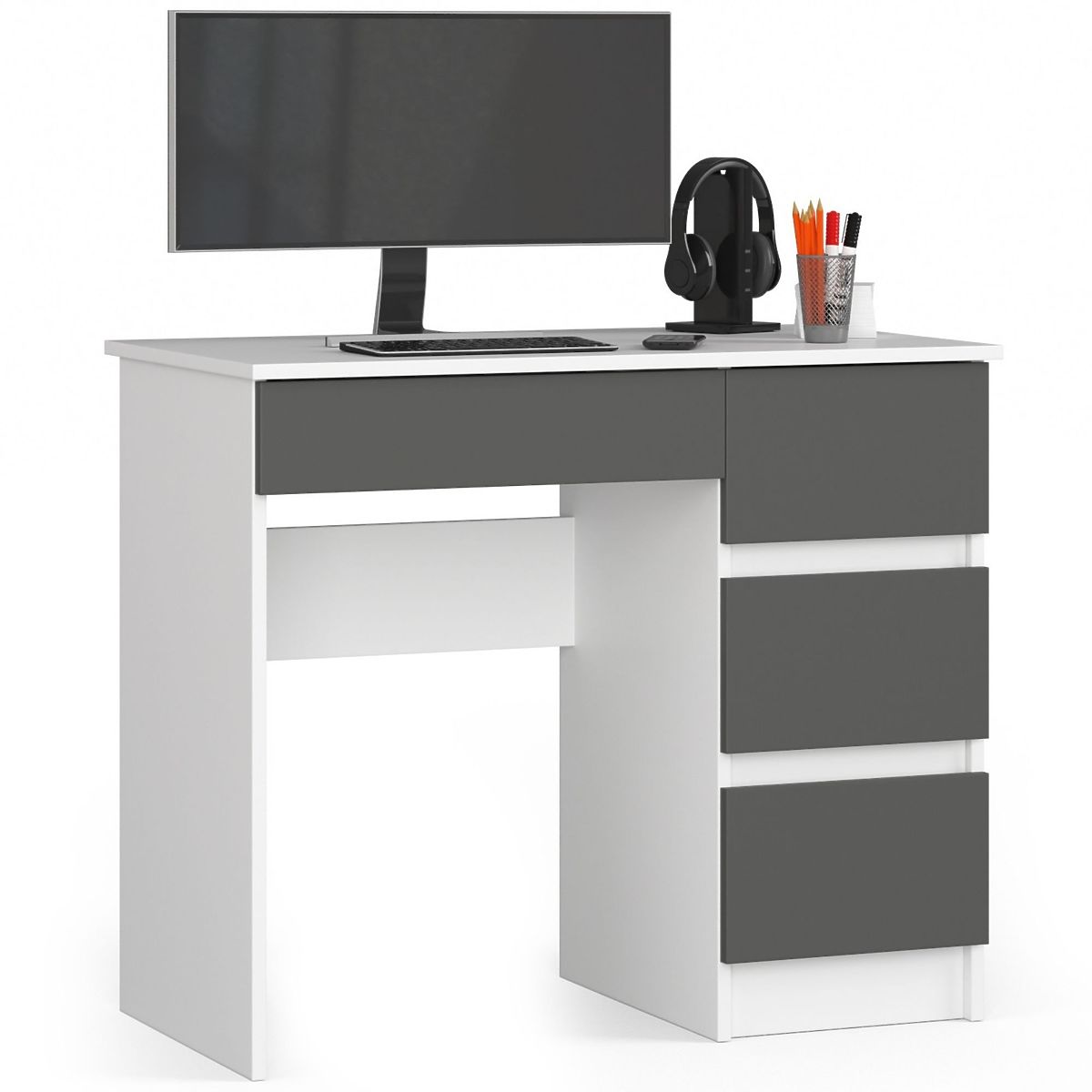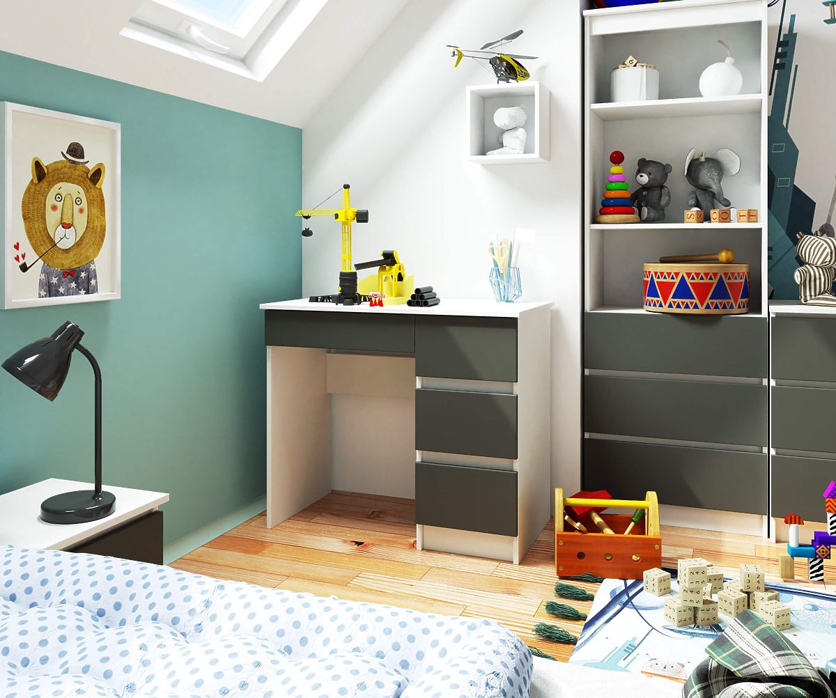 Az A-7 számítógépasztal egy kis bútordarab, amely kis helyen is elfér - legyen az iroda vagy lakótér. Ideális például otthoni irodába vagy gyerek-/ifjúsági szobába. A bemutatott termék két kontrasztos, de remekül kiegészítő színt kombinál - grafit szürke és fehér. Három fiókból áll, amelyek szabadon elrendezhetők. Egyszerű formájú, de rendkívül funkcionális bútor, amelyet biztosan értékelni fognak azok, akik munkasarkot vagy tanulósarkot szeretnének kialakítani, de kevés hely áll rendelkezésükre.