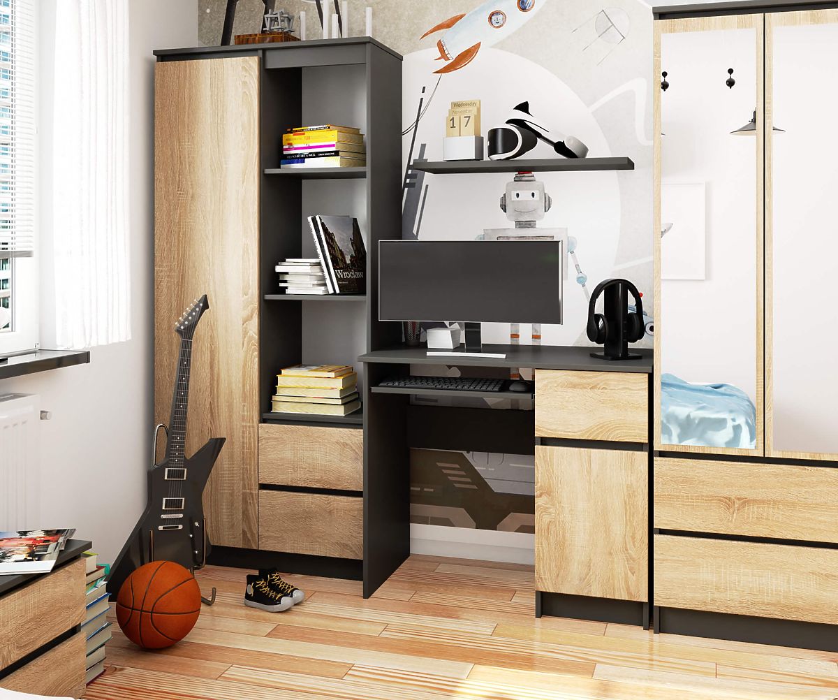 A szabadon álló PIKSEL 90 cm-es asztal GRAFIT SZÜRKE/SONOMA TÖLGY színekben ideális megoldás kis belső terekhez. Nagyon jól szolgálhat iskolai vagy számítógépasztalként. Ergonomikus kialakítása kényelmet biztosít a használat során. Az asztal kihúzható billentyűzettartóval, praktikus oldalsó fiókkal és polcos szekrénnyel van felszerelve, amelyben szabadon állhatnak iratrendezők és könyvek. Az asztal gyártásához kellemes tapintású, könnyen karbantartható, tartós laminált réteggel borított matt lapot használtak. Az egészet praktikus, ezüst színű fogantyúk egészítik ki.