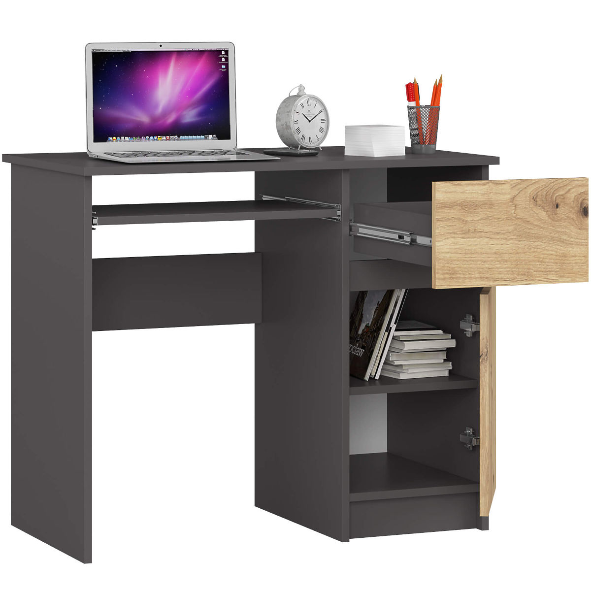 A szabadon álló PIKSEL 90 cm-es asztal GRAFIT SZÜRKE/ARTISAN TÖLGY színekben ideális megoldás kis belső terekhez. Nagyon jól használható iskolai vagy számítógépasztalként. Ergonomikus kialakítása kényelmet biztosít a használat során. Az asztal kihúzható billentyűzettartó polccal, praktikus oldalsó fiókkal és polcos szekrénnyel van felszerelve, amely iratgyűjtőket és könyveket is befogad. Az asztal gyártásához kellemes tapintású és könnyen karbantartható, laminált réteggel borított matt lapot használtak, amely ellenáll a kopásnak. Az egészet praktikus, ezüst színű fogantyúk egészítik ki.