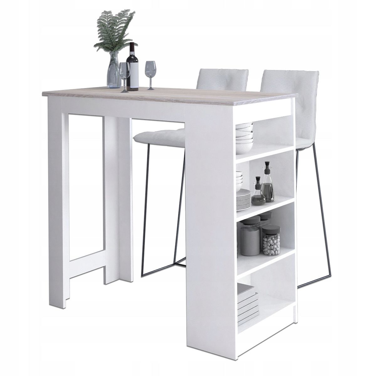 Az Akord üzletben kapható bárasztal bárszékhez, fehér színben, sonoma tölgy asztallappal, tökéletesen illeszkedik különböző színű falakkal, padlókkal vagy más befejező elemekkel rendelkező helyiségekbe. Külső oldalán polcok találhatók, ahol kényelmesen tárolható edények és egyéb kiegészítők. Az asztal CLP bútor rendszerhez való igazítása lehetővé teszi bármilyen elrendezés létrehozását, amely megfelel a projektnek vagy a lakástulajdonos igényeinek.