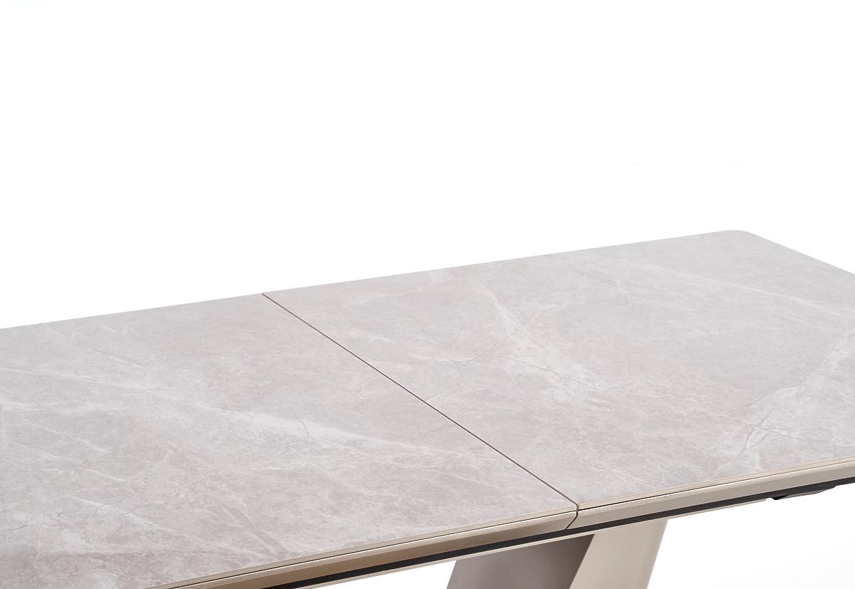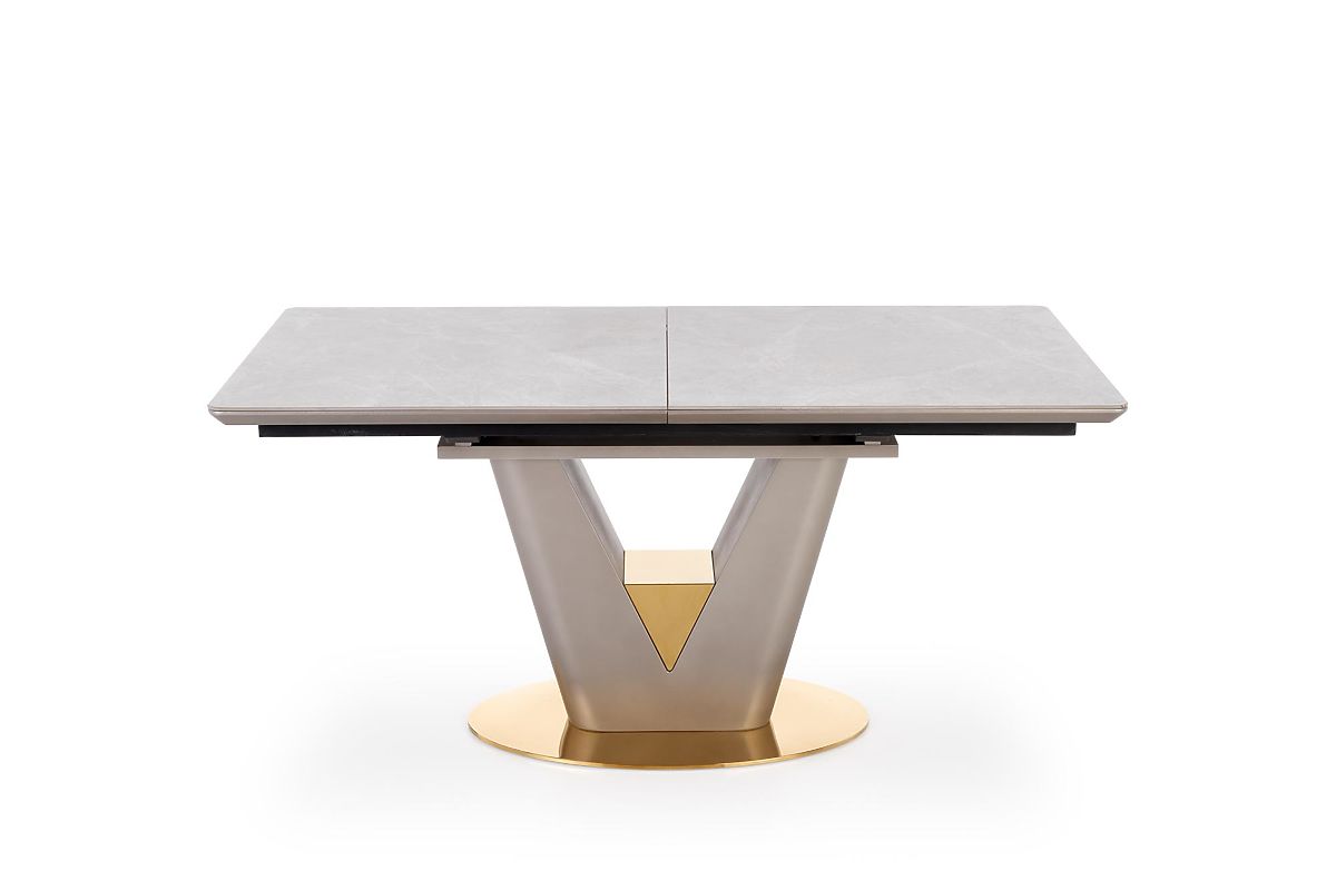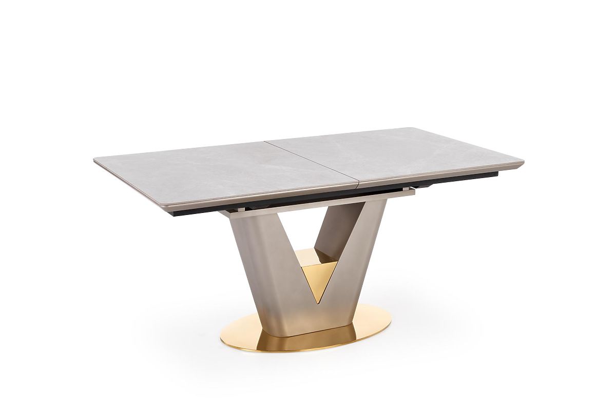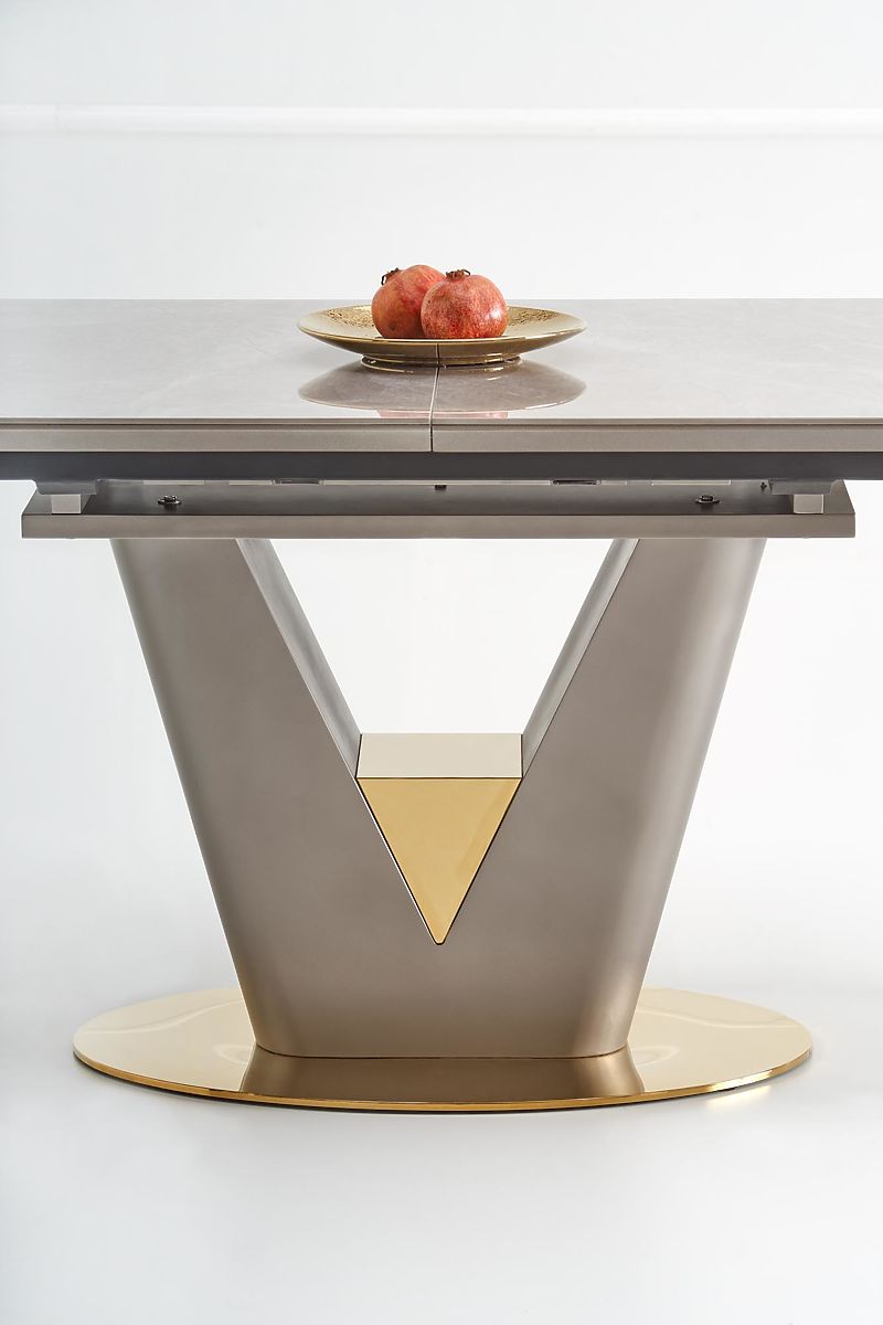A VALENTINO kinyitható étkezőasztal a Halmar márkától a modern elegancia, luxus és funkcionalitás megtestesítője. Exkluzív dizájnjának köszönhetően a modern, glamour vagy reprezentatív stílusban berendezett étkezők vagy konyhák domináns eleme lesz. A téglalap alakú asztallap lekerekített sarkokkal és ferde élekkel kiváló minőségű MDF lapból készült, amelyet világosszürke márvány furnér borít, ami az asztalnak kifinomult és időtálló megjelenést kölcsönöz. Praktikus előnye a kinyitható mechanizmus, amely lehetővé teszi az asztal könnyű meghosszabbítását – kinyitás után a felületet két szürke árnyalatú lakkozott kerámia lap egészíti ki. Az asztal így kényelmesen helyet biztosít akár 8 személy számára. A stabilitást a masszív V alakú acél lábazat biztosítja, amelyet az alsó részen arany ék díszít. Az arany akcentusok az asztal ovális alapzatán is megjelennek, és a szürke kivitelű részekkel együtt luxus és harmonikus kontrasztot alkotnak. A VALENTINO asztal ideális választás azok számára, akik dizájnos, erős és praktikus étkezőasztalt keresnek, amely alkalmazkodik a mindennapi használathoz és ünnepi alkalmakhoz is.