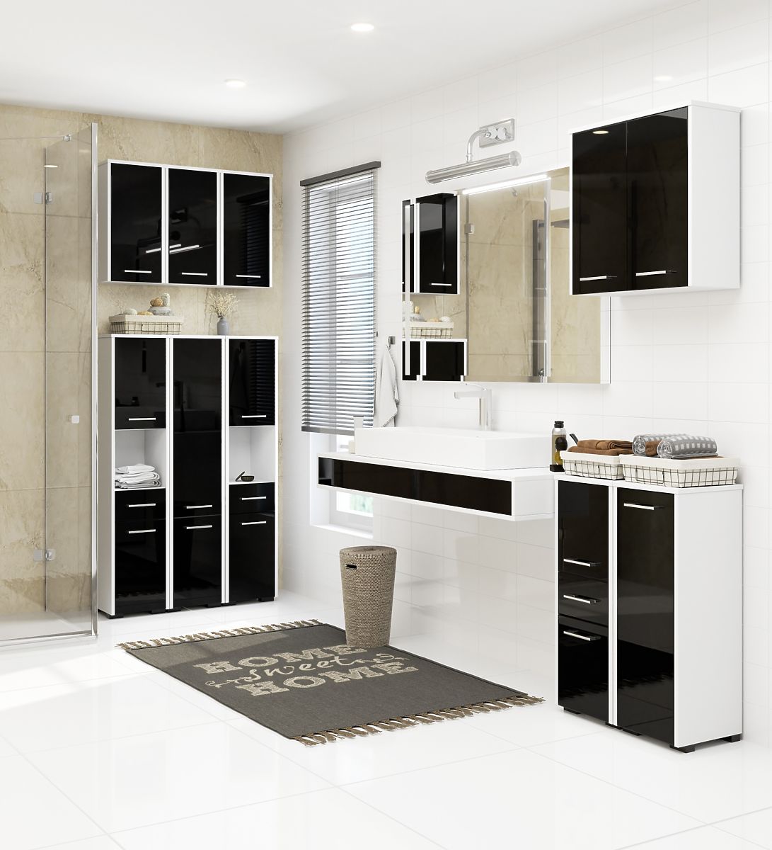 Fekete fényes fürdőszobai polc, sok tárolóhellyel. .. többet