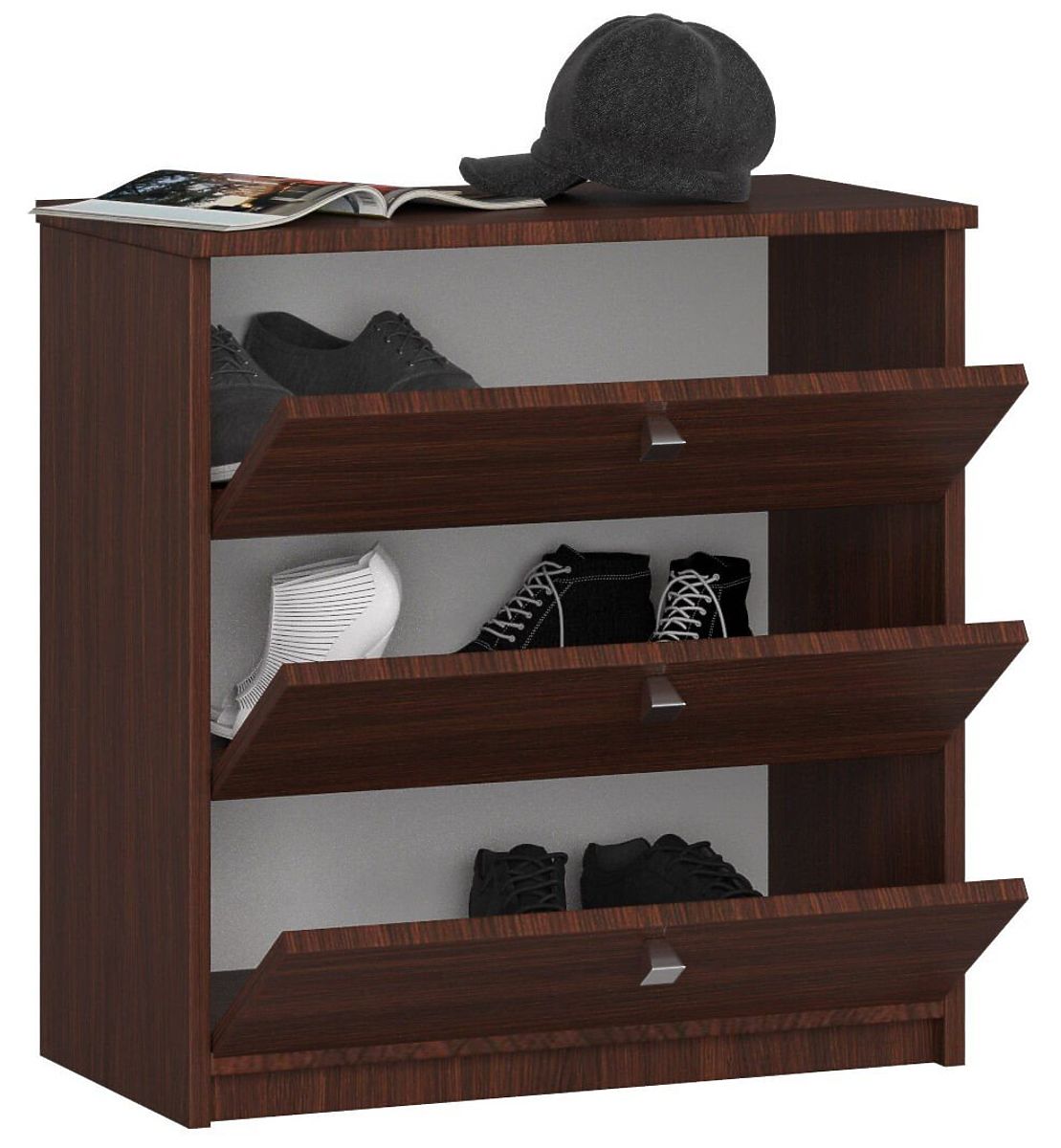 - A cipőtartó előlapjai NEM állnak derékszögben a bútor alapjához képest – az előlapok dőlésszöge a termék jellegzetes tulajdonsága, és nem vonatkoznak rá reklamációs és visszavételi szabályok.