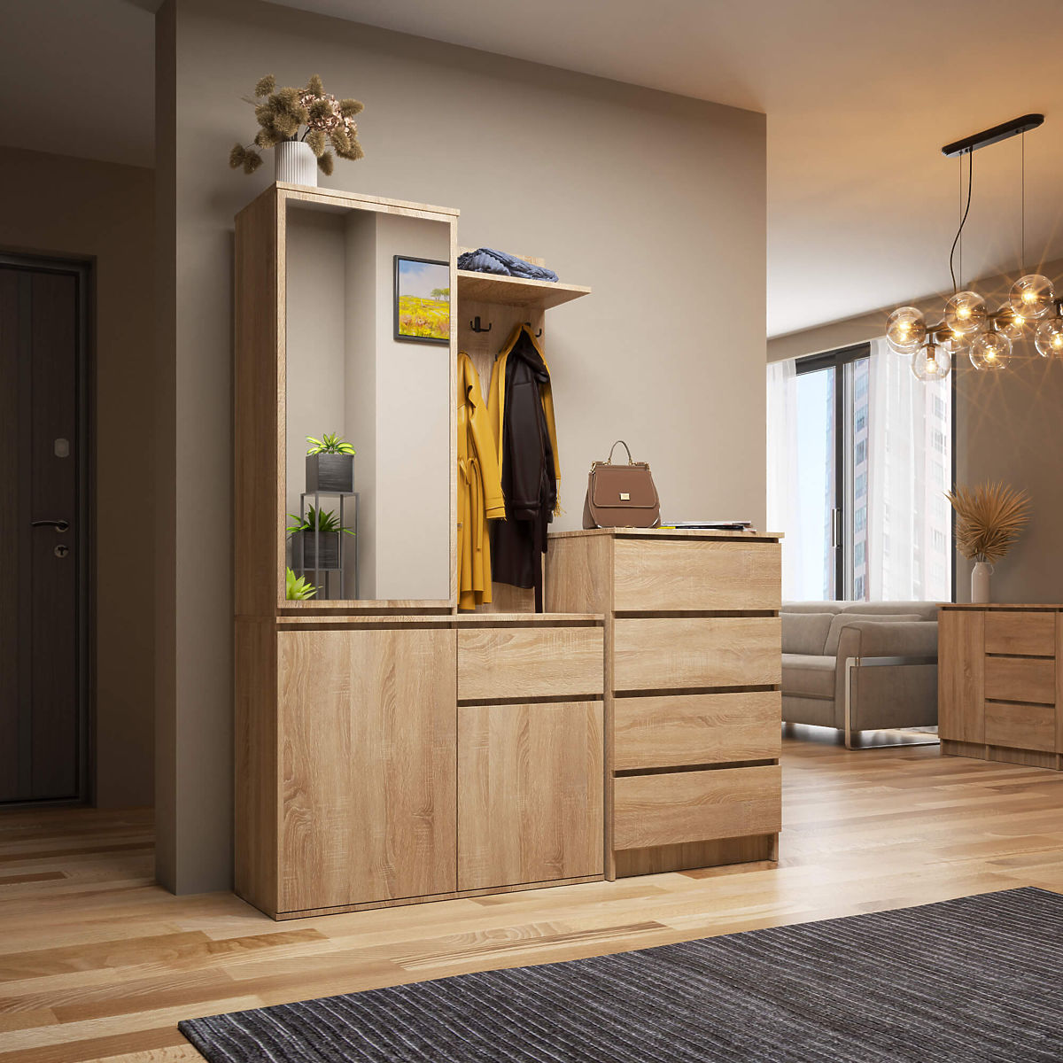 Az ENTRO előszoba szekrény tükrös szekrénnyel, két kisebb belső polcos szekrénnyel, fiókkal, 5 akasztóval és egy polccal a fogasok felett van felszerelve. Ez az elrendezés multifunkcionálissá és meglepően tágassá teszi a bútort. A tükrös szekrényben kényelmes rúd található a ruhák felakasztásához. A nyitott polc hasznos a mindennapi apróságok tárolására. A sekély előszoba szekrény nem foglal sok helyet, így sikeresen elhelyezhető kis és keskeny térben is. Az elegáns dekorációt a Fabryki Mebli AKORD kínálatából származó további előszoba bútorok egészítik ki.