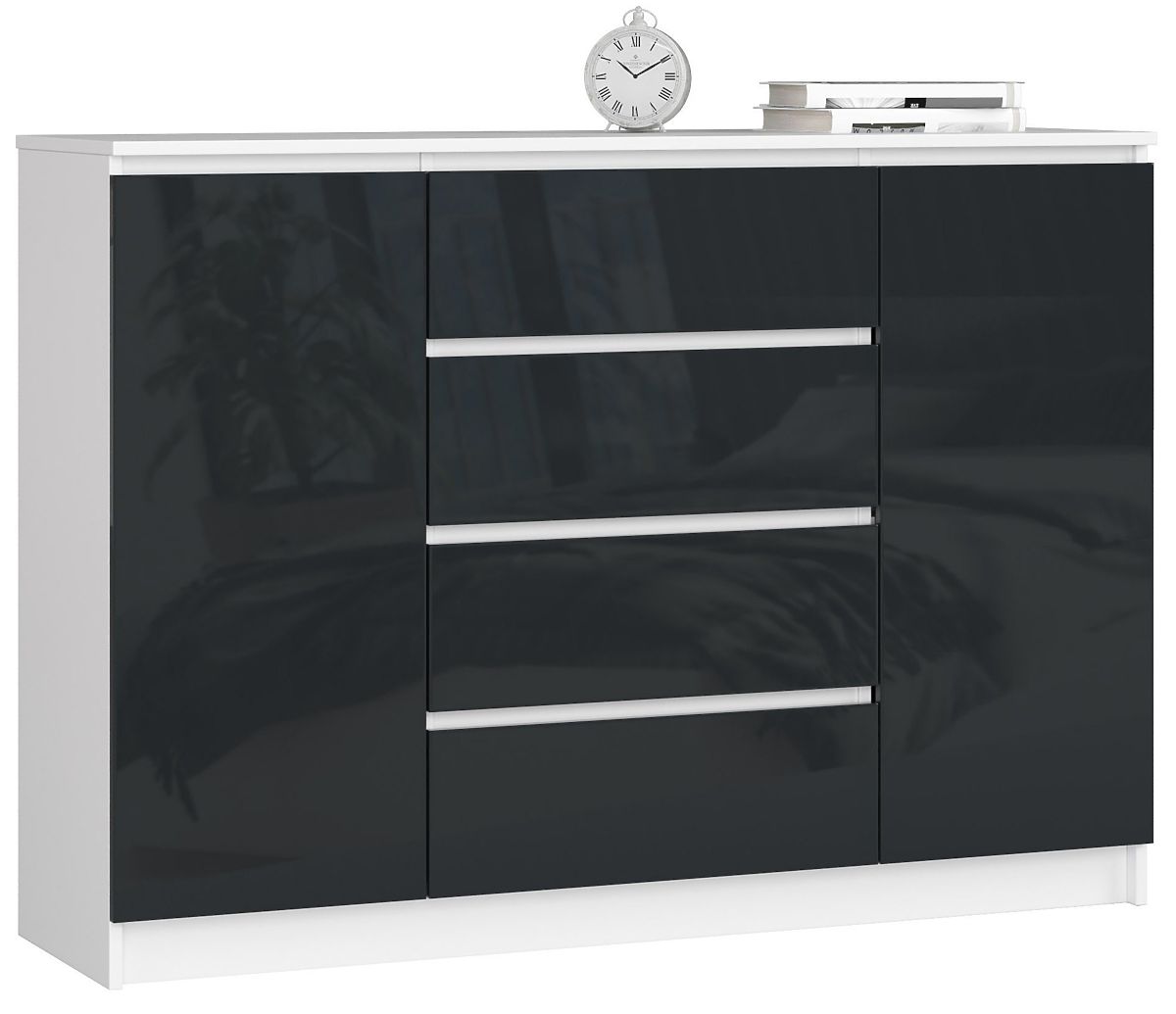 A K 140 fehér-grafit komód univerzális bútor, sokféle felhasználási lehetőséggel. Szinte bármely modern belső térbe illik. Használható komódként a hálószobában vagy gyerekszobában, de tárolóbútorként is apróságok számára a nappaliban. Az étkezőben tágas tálalóként szolgálhat, az előszobában pedig helyet adhat kulcsoknak, táskáknak, sapkáknak vagy sálaknak.