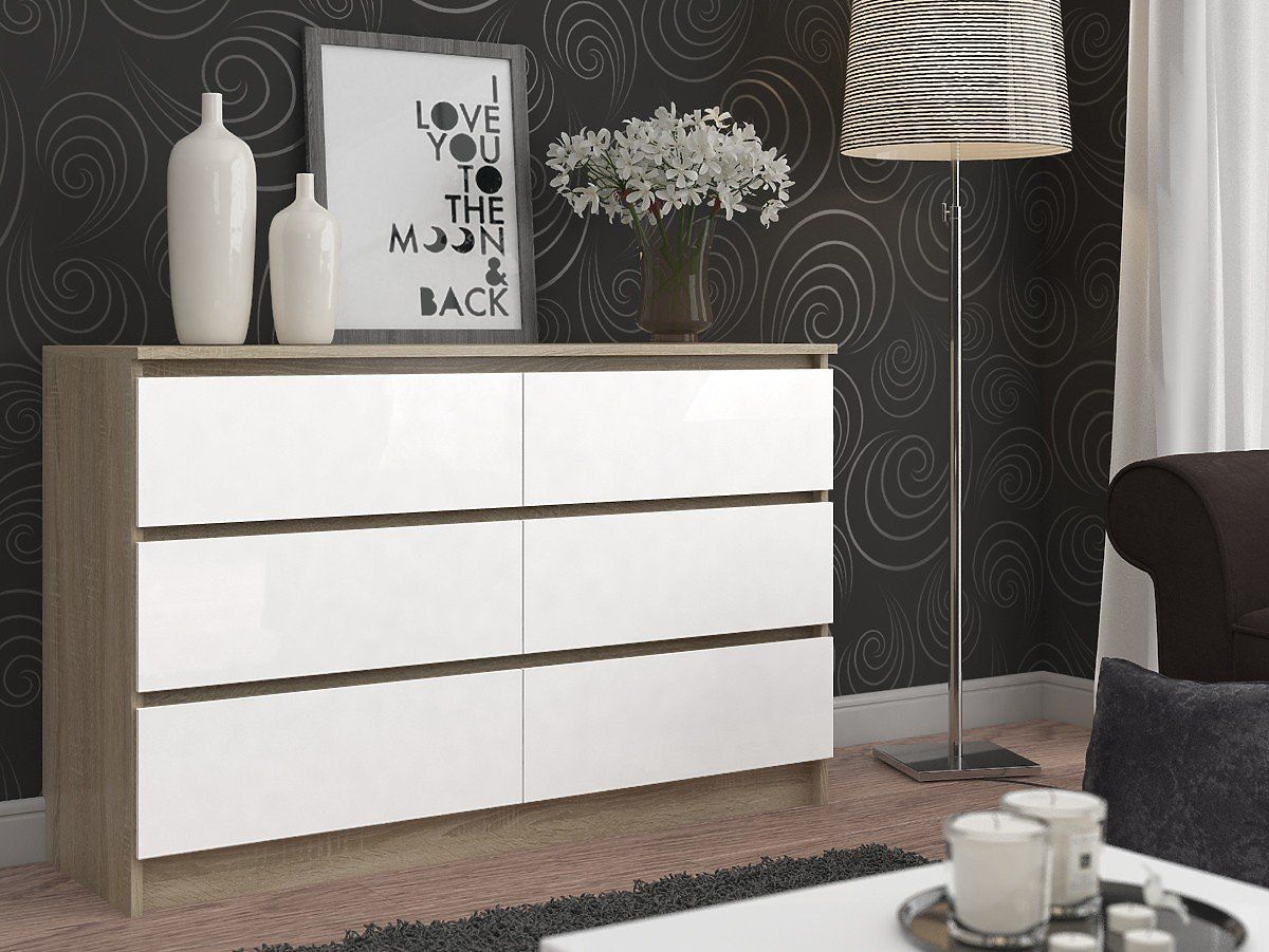 Tágas, modern komód 6 fiókkal, tölgy sonoma és fehér színekben. .. többet