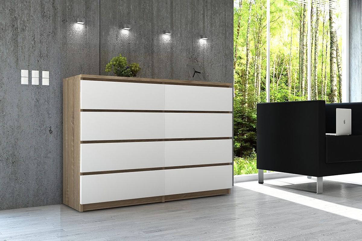 Gyönyörű, modern tervezésű komód, amely sikeresen használható a nappaliban, hálószobában vagy étkezőben, kiváló minőségű termék. A bútor 16 milliméter vastag, kopásálló laminált lapból készült, tartós és minden belső térben szépen mutat. A komód élei ABS élzárással vannak ellátva. A fehér előlapok tökéletesen illeszkednek a jelenlegi trendekhez, és külön figyelmet érdemel a bútor szilárd szerkezete, amely nyolc tágas fiókkal van felszerelve. A fiókok fém golyós csúszkákon mozognak, és az egész bútort önálló összeszerelésre tervezték. Ez egy ajánlat azok számára, akik lépést akarnak tartani a korral, miközben időtálló, univerzális színvilágú bútort választanak. A komód kombinálható más, azonos stílusú bútorokkal, amelyek szintén részei kínálatunknak. Javasoljuk, hogy ismerkedjen meg gazdag választékunkkal, amely kedvező áron elérhető.