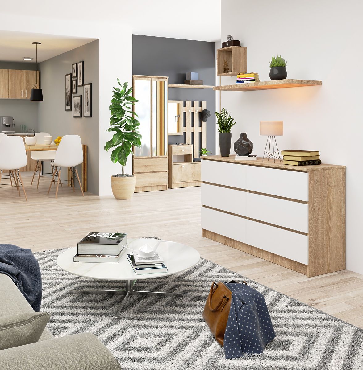 Tágas, 6 fiókos komód fehér és sonoma tölgy színben. .. többet