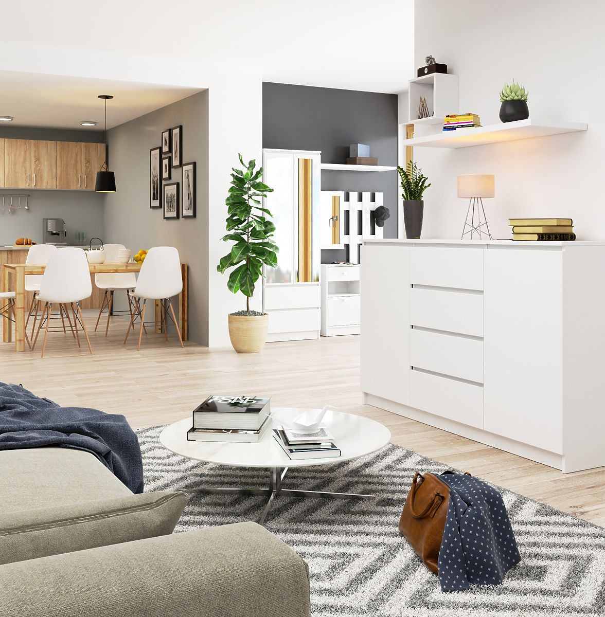A K160 komód funkcionális bútor, amely sok szabad teret biztosít a használatra. Fehér színe miatt ideális választás skandináv és minimalista berendezésű enteriőrökbe. A bútor egyszerű formájú, ami nagy univerzalitást kölcsönöz neki: elhelyezhető lakásban és irodában egyaránt. A komód hossza 160 cm, magassága 99 cm. Mélysége 40 cm. Tartós, 16 mm vastag laminált lemezből készült, a Kronospan gyártótól. Továbbá az élei ABS éllel vannak borítva, ami további védelmet nyújt a sérülések ellen. A bútor két szekrényből áll, mindegyikben egy-egy polc található. Négy fiókkal is rendelkezik, amelyek fém golyóscsapágyas síneken mozognak. A bútor magas használati kényelmet biztosít, tágas és funkcionális.