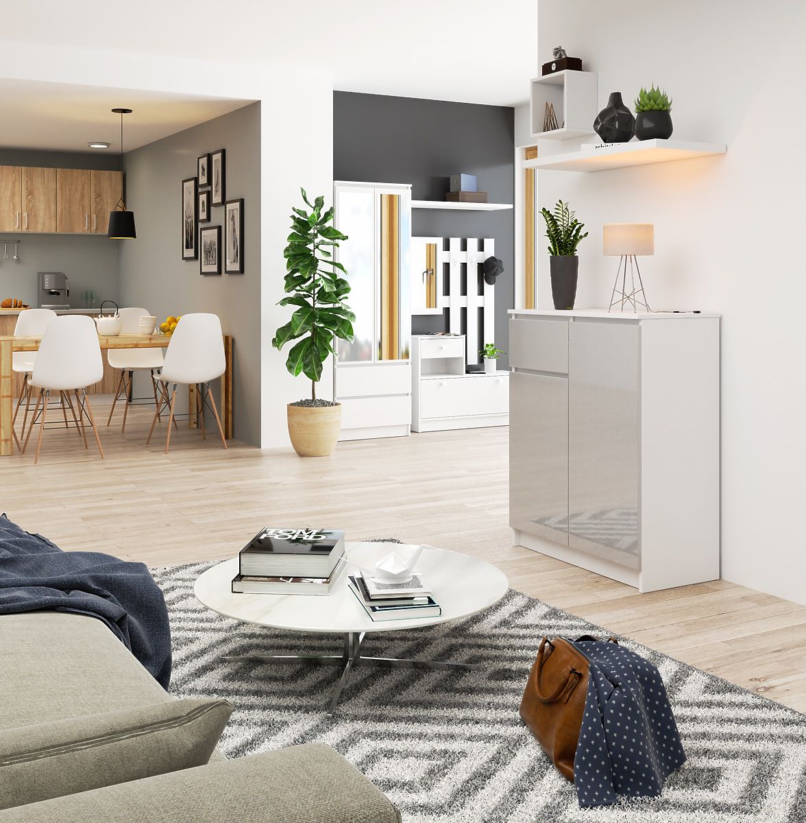 A fehér-metál K 80 komód modern, sőt minimalista bútor, ugyanakkor univerzális a funkcionalitás szempontjából. Számos felhasználási lehetőséget kínál – jól beválik gyerekszobai fiókos szekrényként, nappali vagy hálószobai apró tárgyak tárolójaként, sőt, praktikus szekrényként kulcsok, sapkák vagy táskák számára az előszobában. Tökéletesen illeszkedhet egy minimalista étkezőbe is.
