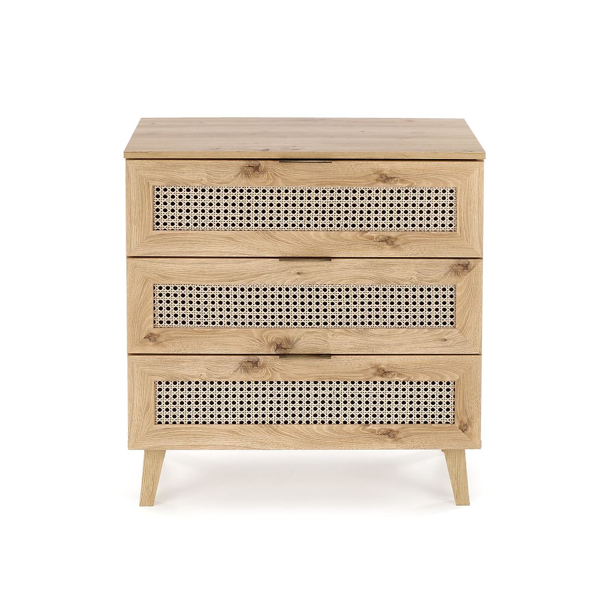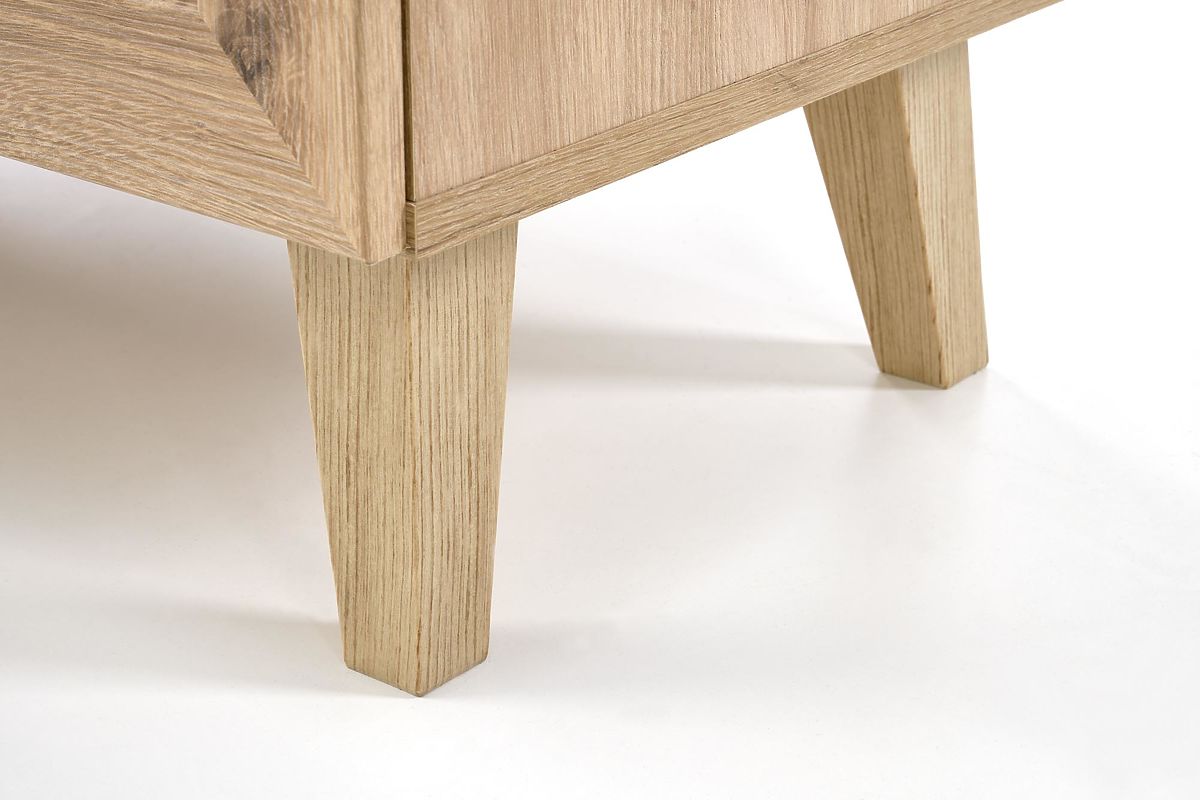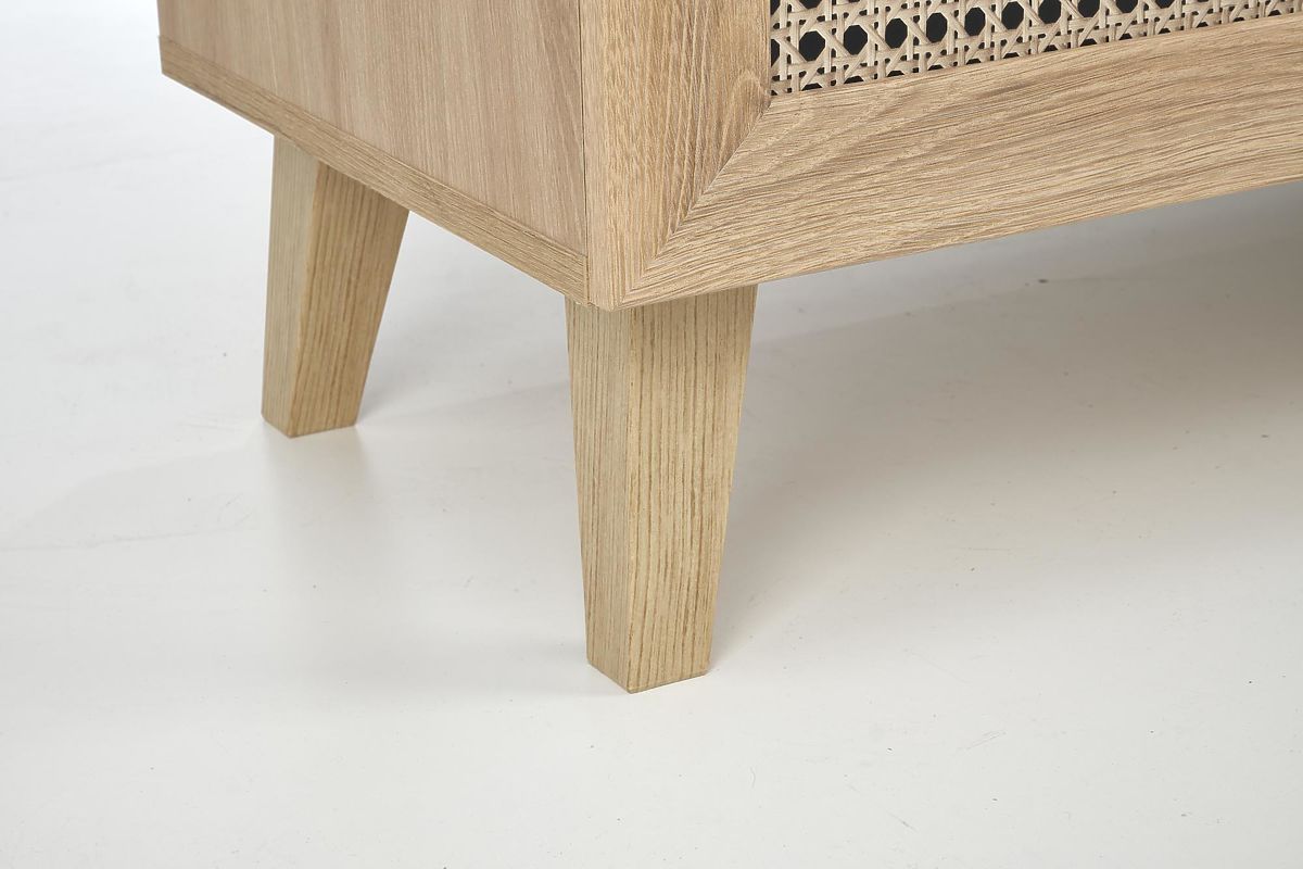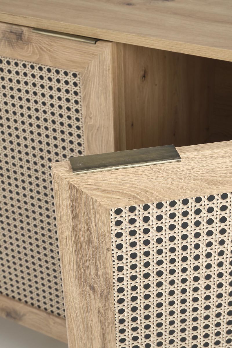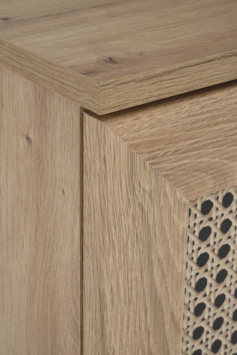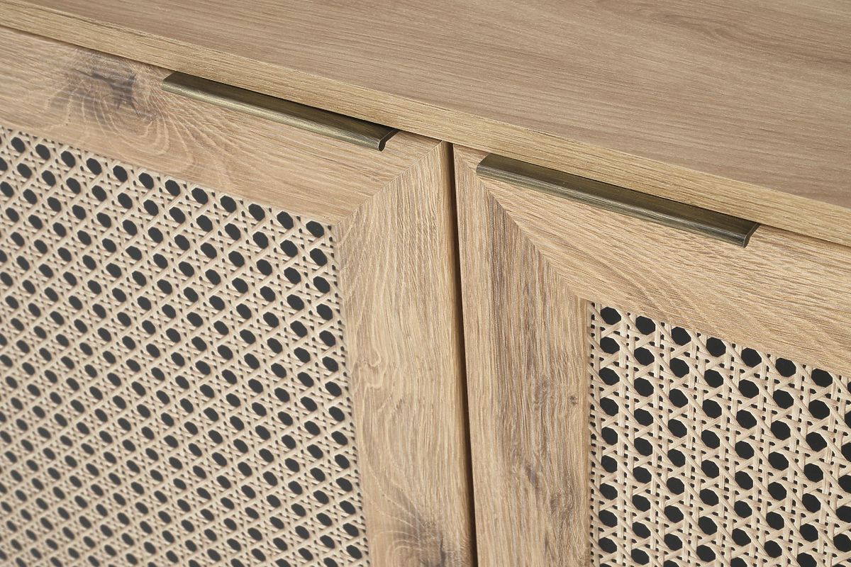 Az artisan tölgy dekor és a divatos bécsi fonat mintájú betétek egyedi boho hangulatot kölcsönöznek a komódnak, amely azonnal magára vonzza a figyelmet.