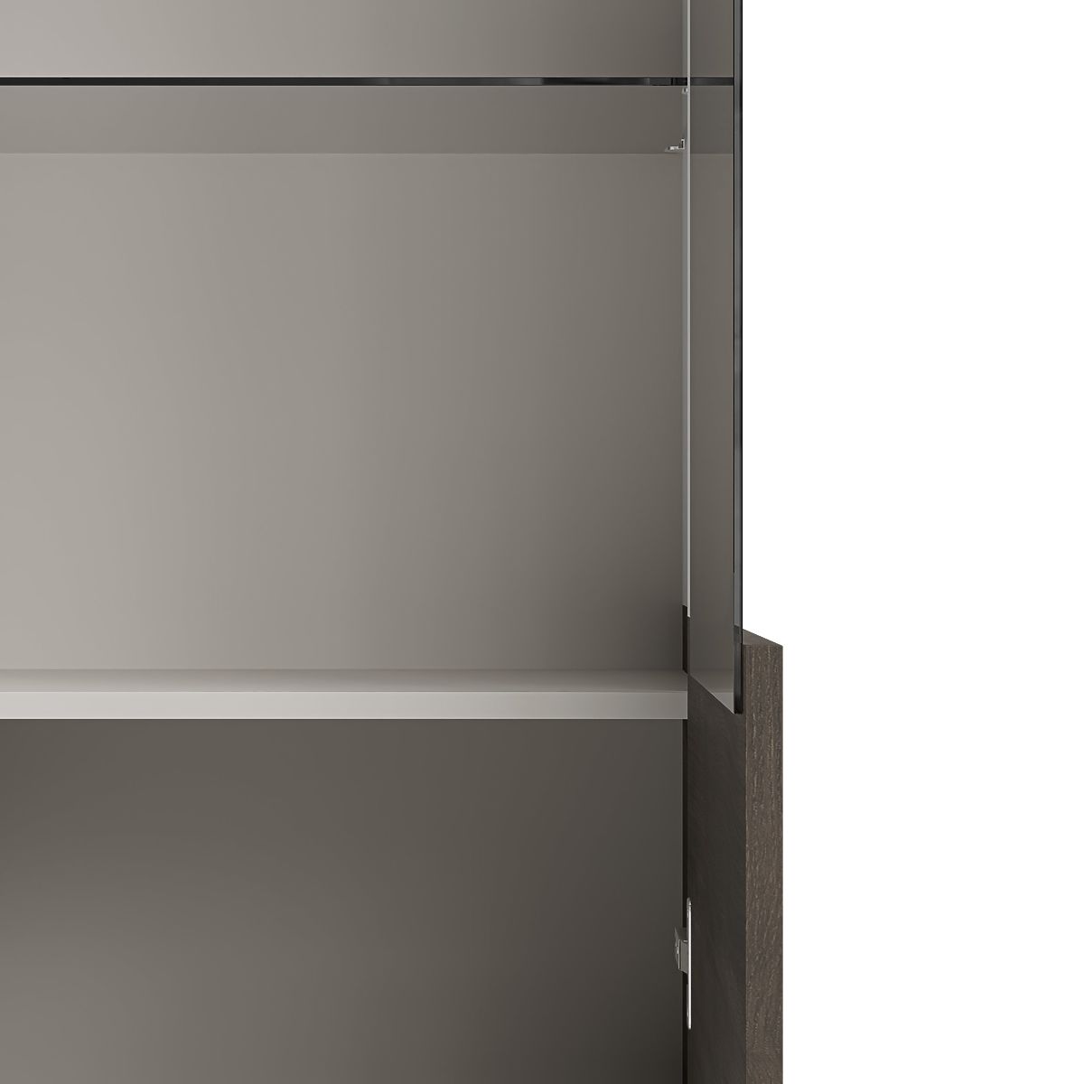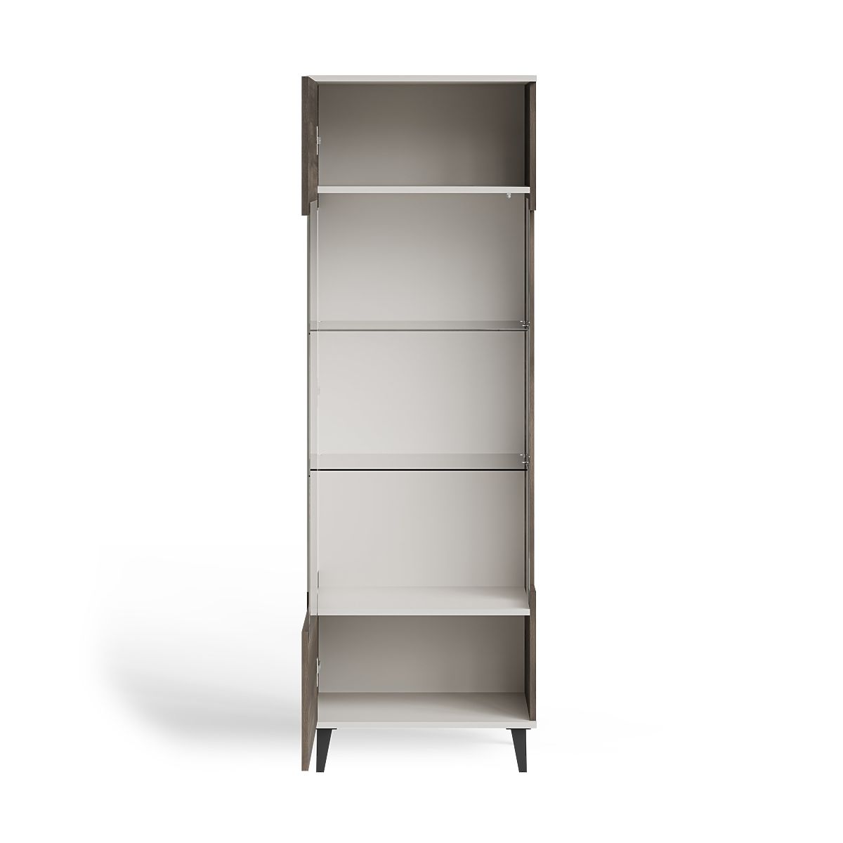 A RANDOM vitrin elegáns és feltűnő kiegészítője a belső térnek, amely azonnal magára vonja a figyelmet. Az oldalán található fekete, finoman redőzött „függöny” stílusosan takarja el az üvegajtókat, és egy csipetnyi titokzatosságot és kifinomultságot kölcsönöz a vitrinnek. A kasmír, diófa és fekete részletek harmonikus kombinációja modern és időtlen megjelenést kölcsönöz, amely tökéletesen illeszkedik nappalikba, hálószobákba, dolgozószobákba és előszobákba. Az üvegajtók mögött három tágas polc található, ideális dekorációk, könyvek, személyes emlékek vagy egyéb apróságok kiállítására. A 182 cm-es magasságának köszönhetően a vitrin elegendő tárolóhelyet biztosít, anélkül hogy veszítene vizuális könnyedségéből és eleganciájából. A vitrin alacsony lábai, amelyek tompa szögben hajlanak, stabilitást és szilárd alapot biztosítanak, míg a kiváló minőségű anyagok – MDF furnérozott lap, furnérozott bútorlap és polipropilén elemek – hosszú élettartamot és mindennapi használatnak ellenálló tartósságot garantálnak. A RANDOM vitrin így nemcsak szép látvány, hanem funkcionális és praktikus is.