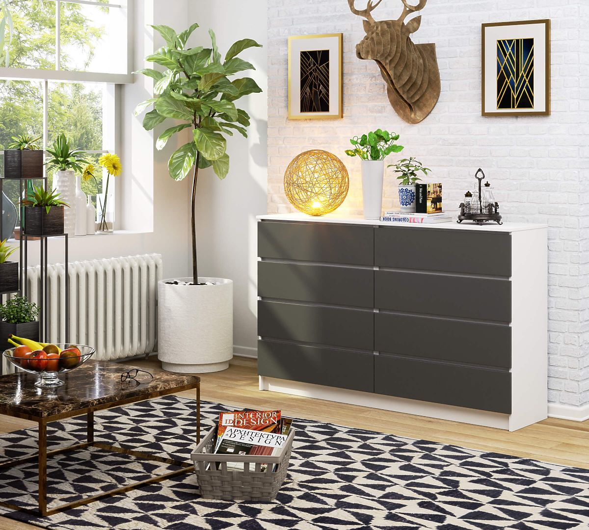 160 cm széles komód 8 fiókkal, fehér és szürke színben. .. többet
