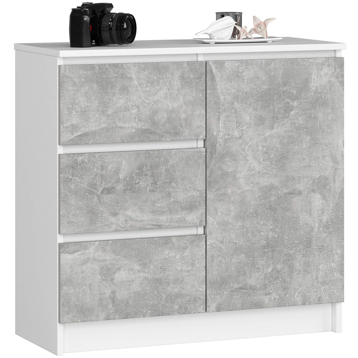 A kis komód olyan bútordarab, amely minden helyiségben hasznos lehet. A modern színek, a masszív szerkezet és a gondos kidolgozás révén egy olyan szekrény jött létre, amely például az előszobában, a nappaliban vagy a fiatalok szobájában, valamint a hálószobában is megállja a helyét. Irodai térben is használható, ahol számos dokumentum és egyéb irodai kellék tárolását teszi lehetővé. A komód egy ajtóból (belül két polccal) és 3 fiókból áll. A bútor fehér és beton színeket kombinál.