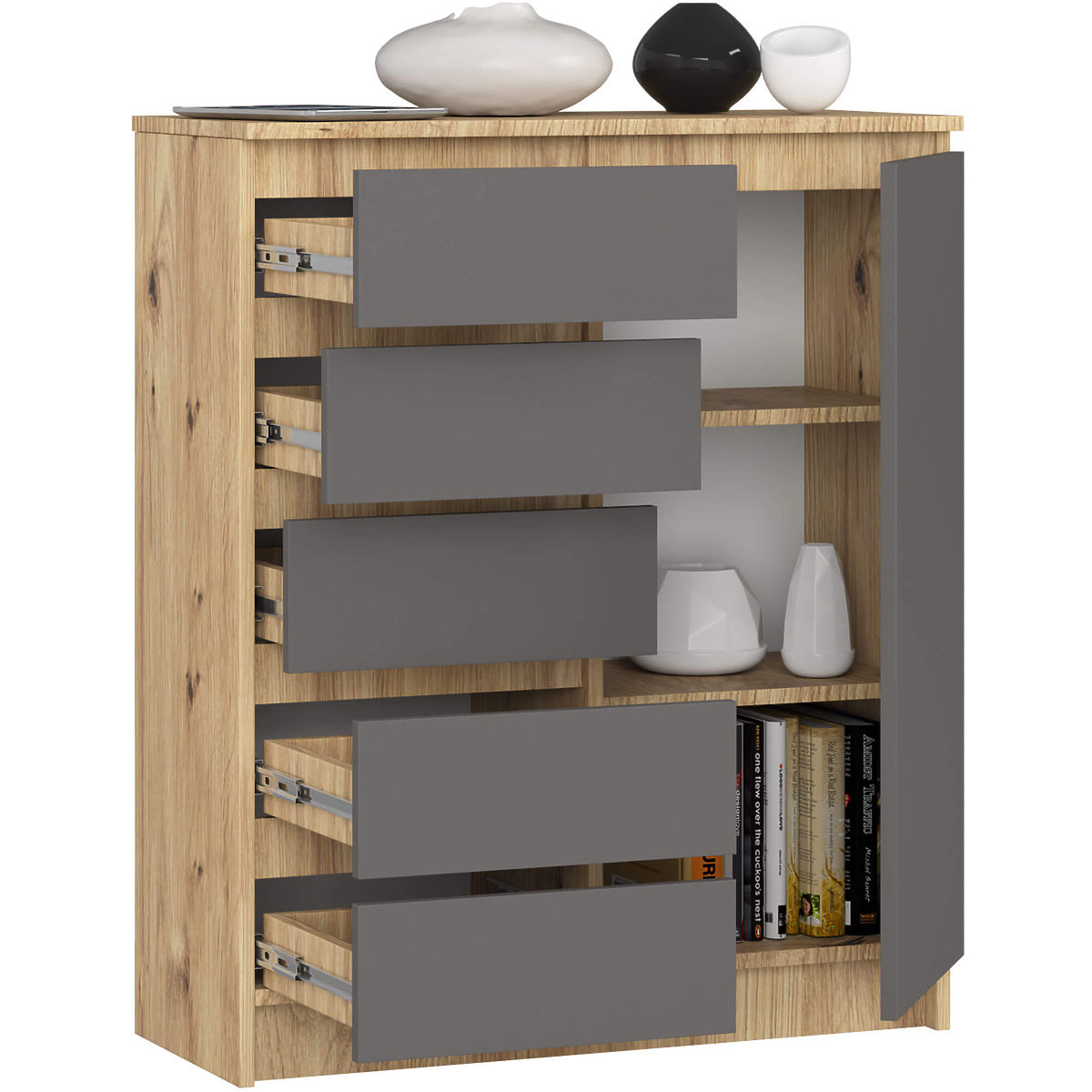 80 cm széles komód 5 fiókkal és 1 ajtóval, artisan tölgy és grafit szürke színben. .. többet