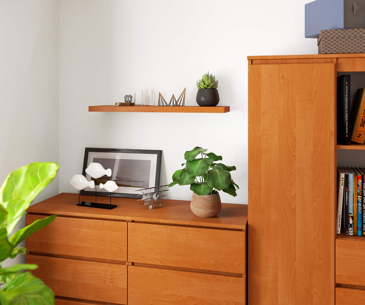 Kopásálló laminált lapból készült. A szélek melaminnal vannak bevonva. A csomagolás láthatatlan fali rögzítőket tartalmaz.
