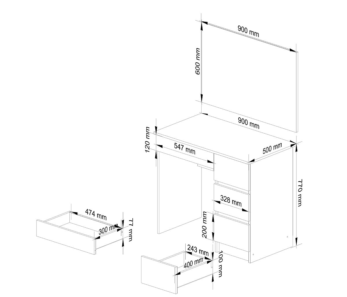 A kozmetikai sminkasztal tükörrel kiváló bútordarab a sminkeléshez. A sminkasztalnak van egy funkcionális asztallapja, amelyre a legszükségesebb dolgokat lehet helyezni, és négy tágas fiókja, amelyek minden apróságot befogadnak. Az egyedi tükörrel együtt a sminkasztal ideális feltételeket teremt a sminkeléshez, és a mindennapi női rutin sokkal kellemesebbé válik. A sminkasztal megfelelő méretei (77 cm magasság, 90 cm szélesség, 50 cm mélység) kényelmes mozgást és használatot biztosítanak. A nagy tükör (60 cm x 90 cm) lehetővé teszi a legbonyolultabb kozmetikai műveletek precíz végrehajtását is. Ez a szett kis helyen is megállja a helyét. A sminkasztal tartós, kopás- és sérülésálló laminált lapból készült, és a semleges, divatos fehér szín minden belső térhez illik. Ideális bútor a hálószobába vagy más helyiségbe, amely minden szépségápoló nő örömére szolgál.